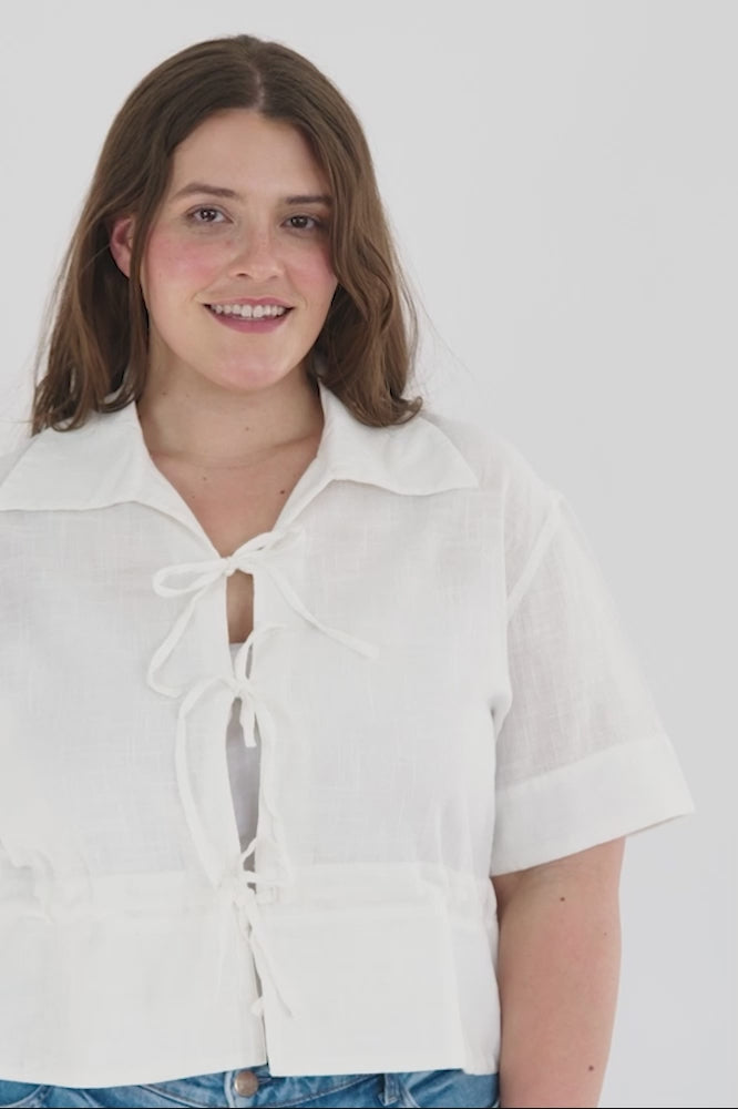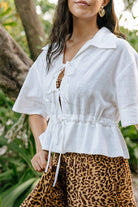 This lightweight blouse is composed of 100% cotton for a breezy top that's as comfortable as it is stylish. The ruffled hem gives the crisp white shirt a feminine feel, and the sweet bow closures provide a unique twist on the classic short-sleeved button-up look.