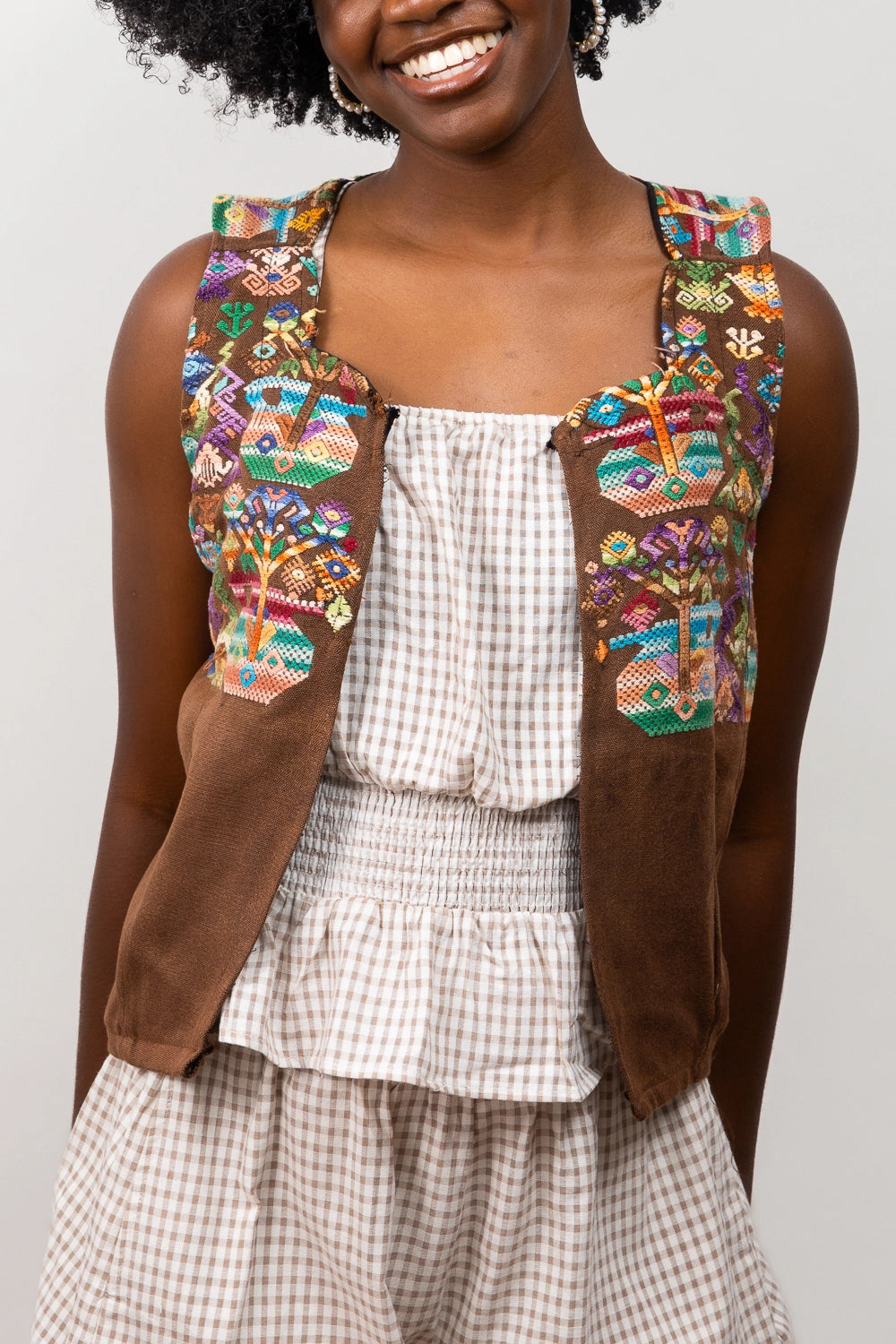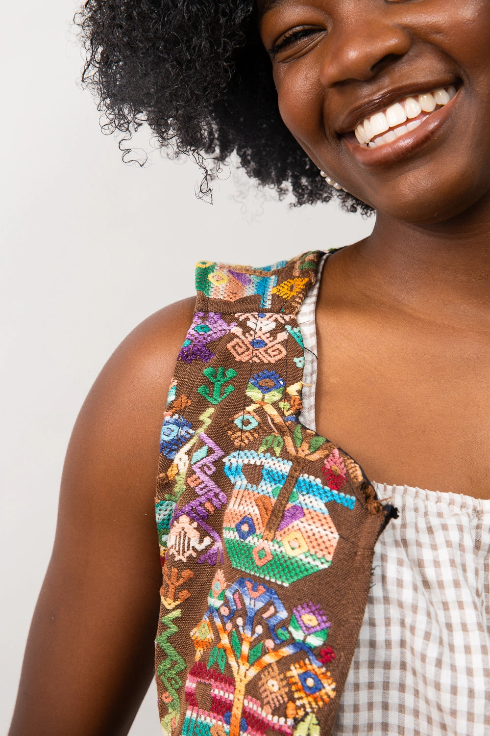 Modern vest-style huipil, square neckline, handmade and hand-embroidered by Guatemalan artisans. Each piece is one of a kind. All sales are final - Because this is a one-of-a-kind, repurposed vintage piece, we’re not able to accept general returns. That said, we want you to love how it fits. If the sizing isn’t quite right, reach out to us —we’re happy to help