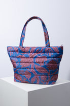 The Quilted Cotswold Tote is a large, square shaped tote that tapers up towards the top, making it slightly wider at the top than at the base. It is made of a quilted print fabric. The fabric has a blue background and a maroon and pink floral pattern. There is a zip closure at the top and two handles, allowing the bag to be slung over the shoulder.