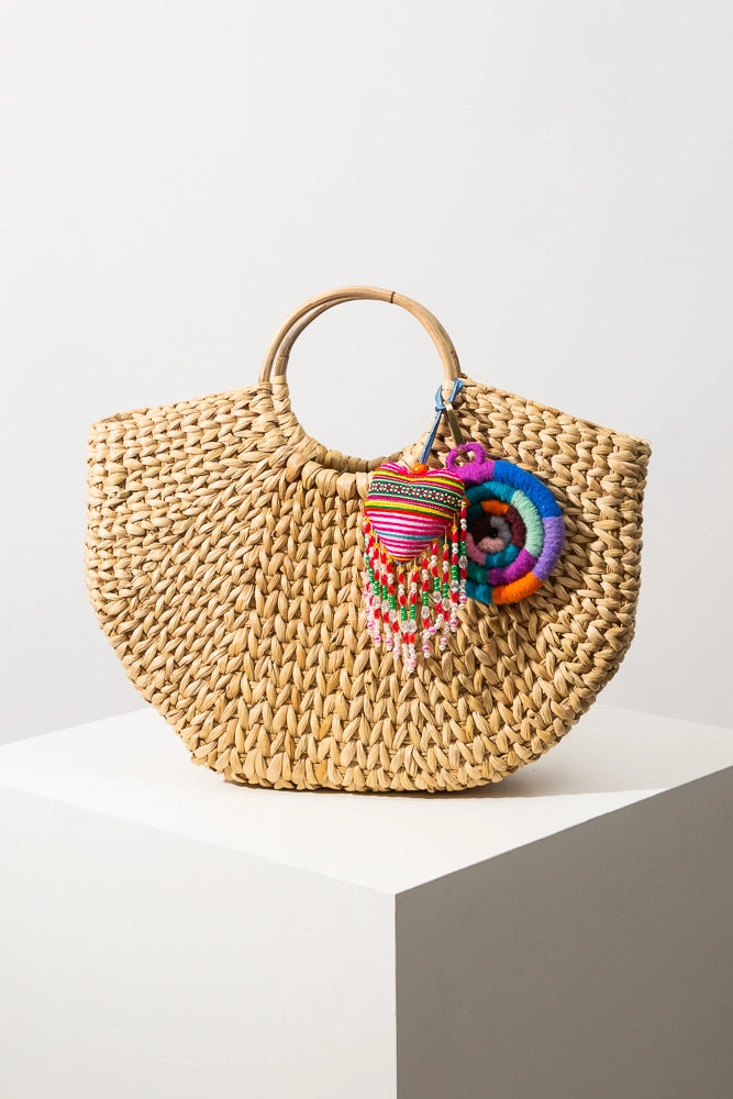 Bring some vibrant personality to every look with this multicolor bag charm composed of brass and brightly colored wool. When our Artisan Partners in Peru create their signature woven bags and scarves, they are left with beautiful threads that are too small to use for weaving. With these textile-inspired accessory charms, those threads are put to a beautiful and sustainable use!