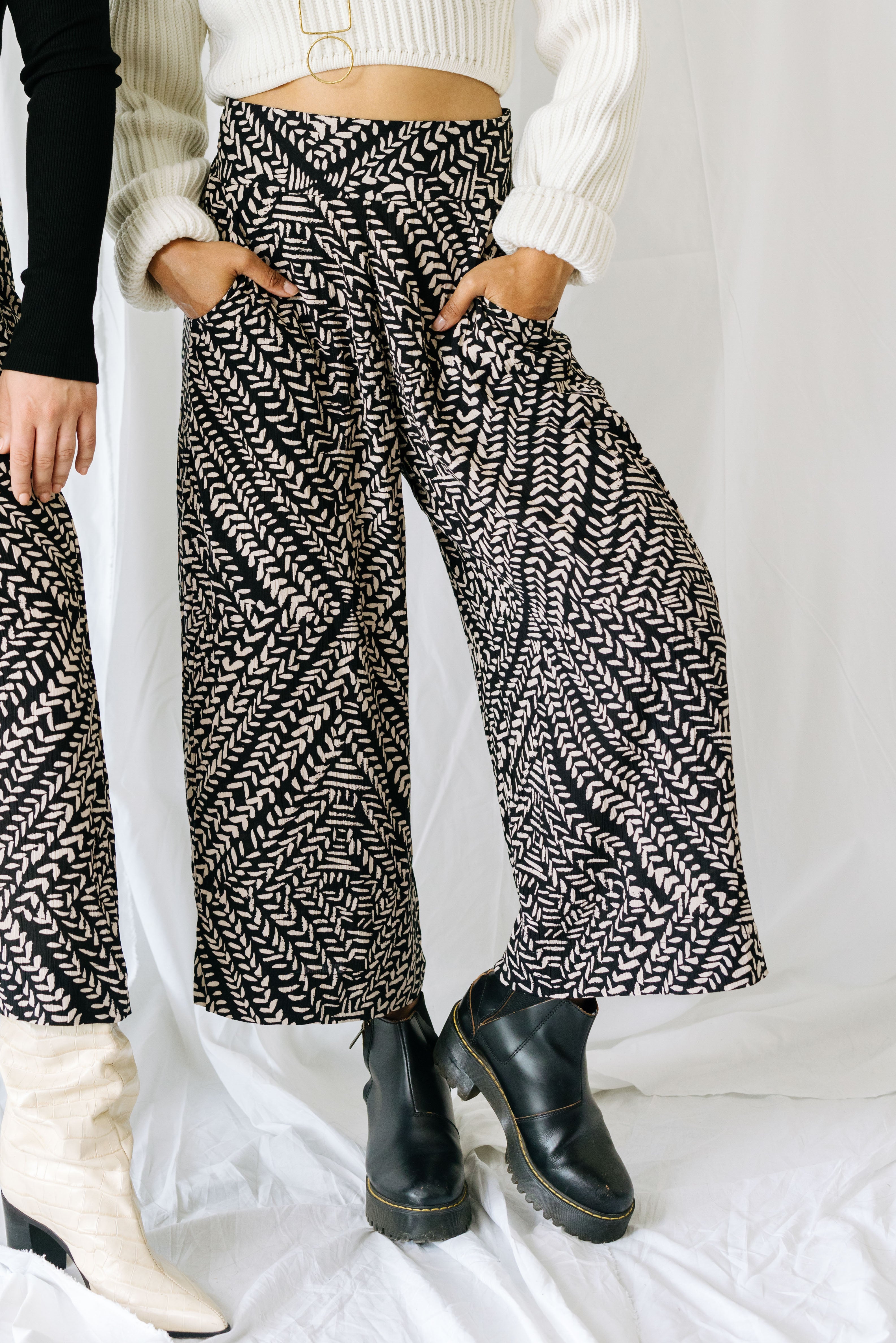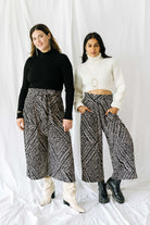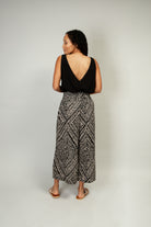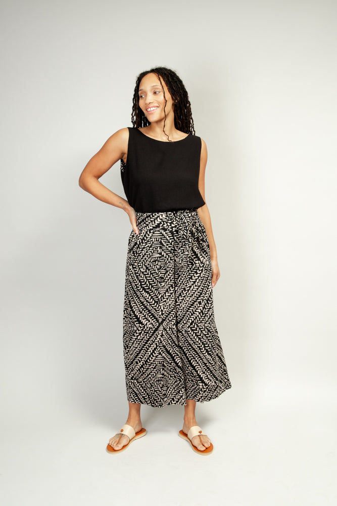 High Waisted, Elastic Waist, Front Pockets, Wrap Tie, Cropped Length | Size 1: 37" Long, 32"-38" Hip, 23" Inseam, Fits US Sizes 2-8 | Size 2: 37" Long, 40"-46" Hip, 22" Inseam, Fits US Sizes 10-16 | Size 3: 37" Long, 48"-56" Hip, 20" Inseam, Fits US Sizes 18-24