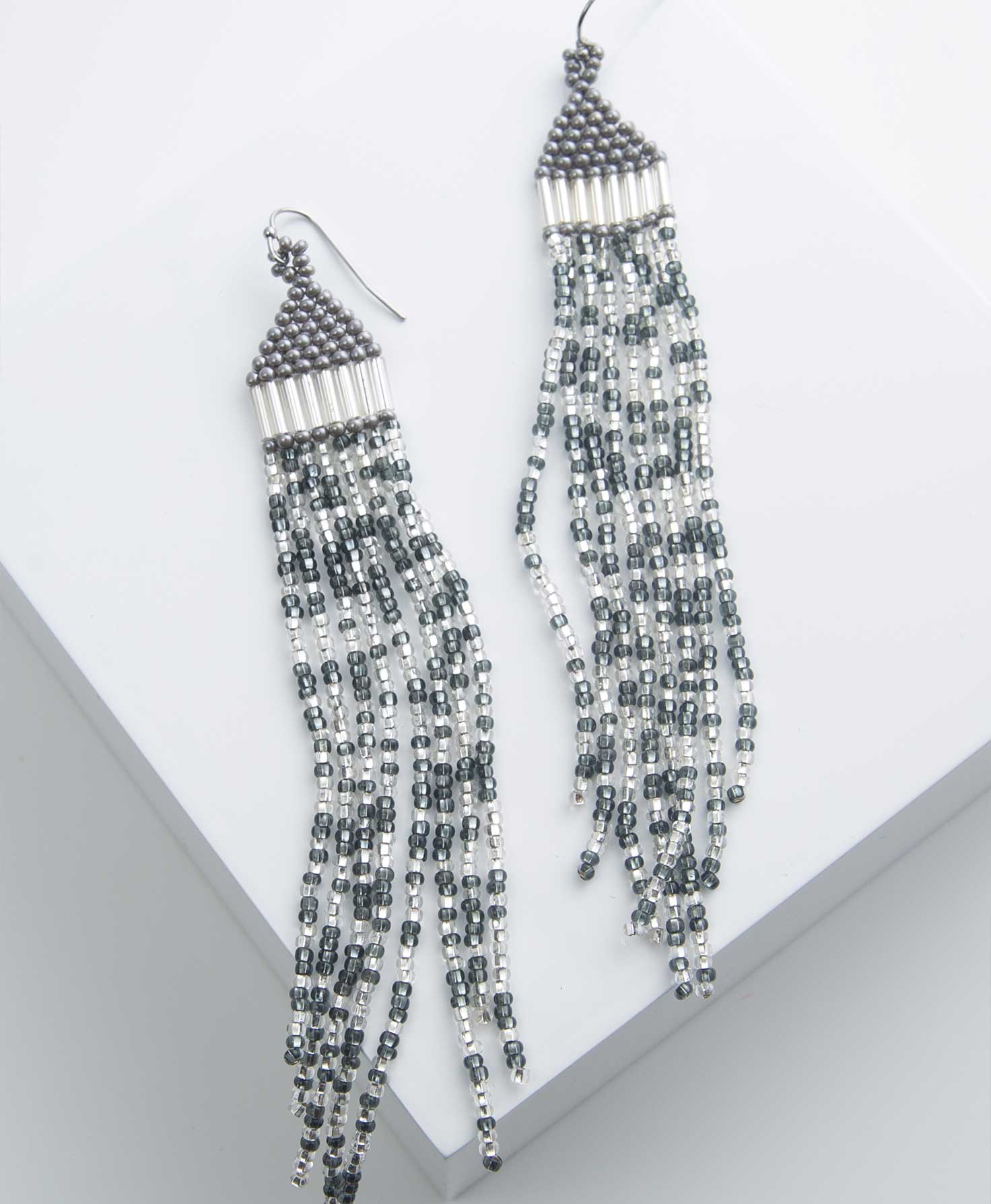 Artisans in Guatemala string dozens of tiny glass beads by hand to create these show-stopping earrings. Long strands of grey and transparent beads form a glittering fringed pair that will turn heads no matter what you wear them with. Featuring stainless steel hooks for sensitive ears.