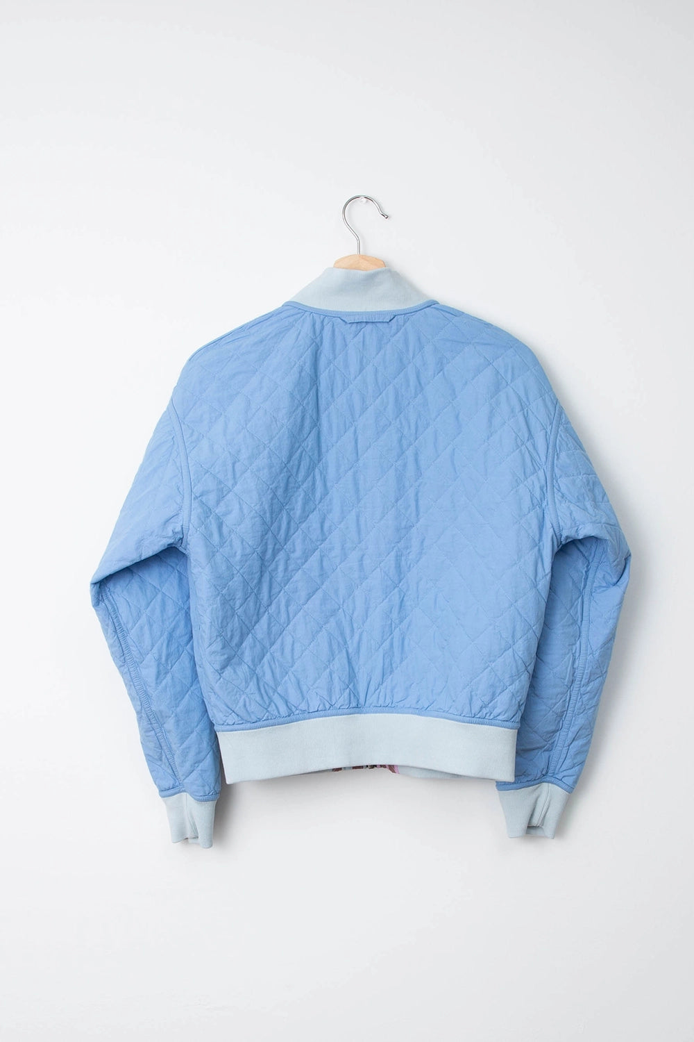 One side features a playful mix of modern stripes in wam and cool tones, inspired by global textile traditions. Flip it inside out, and you get a soft, solid quilted blue - clean, calm, and effortlessly polished. The lightweight quilted construction makes it perfect for transitional weather, while ribbed cuffs and hem keep the silhouette relaxed but refined.
