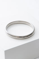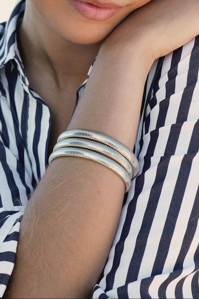 This simple silver coil bracelet is composed of stunning polished stainless steel. The neutral bracelet looks chic worn alone, or can be paired with other bracelets to create a more complex look. Each Cobra Bracelet helps women in East Asia overcome exploitation and begin a hopeful new chapter.