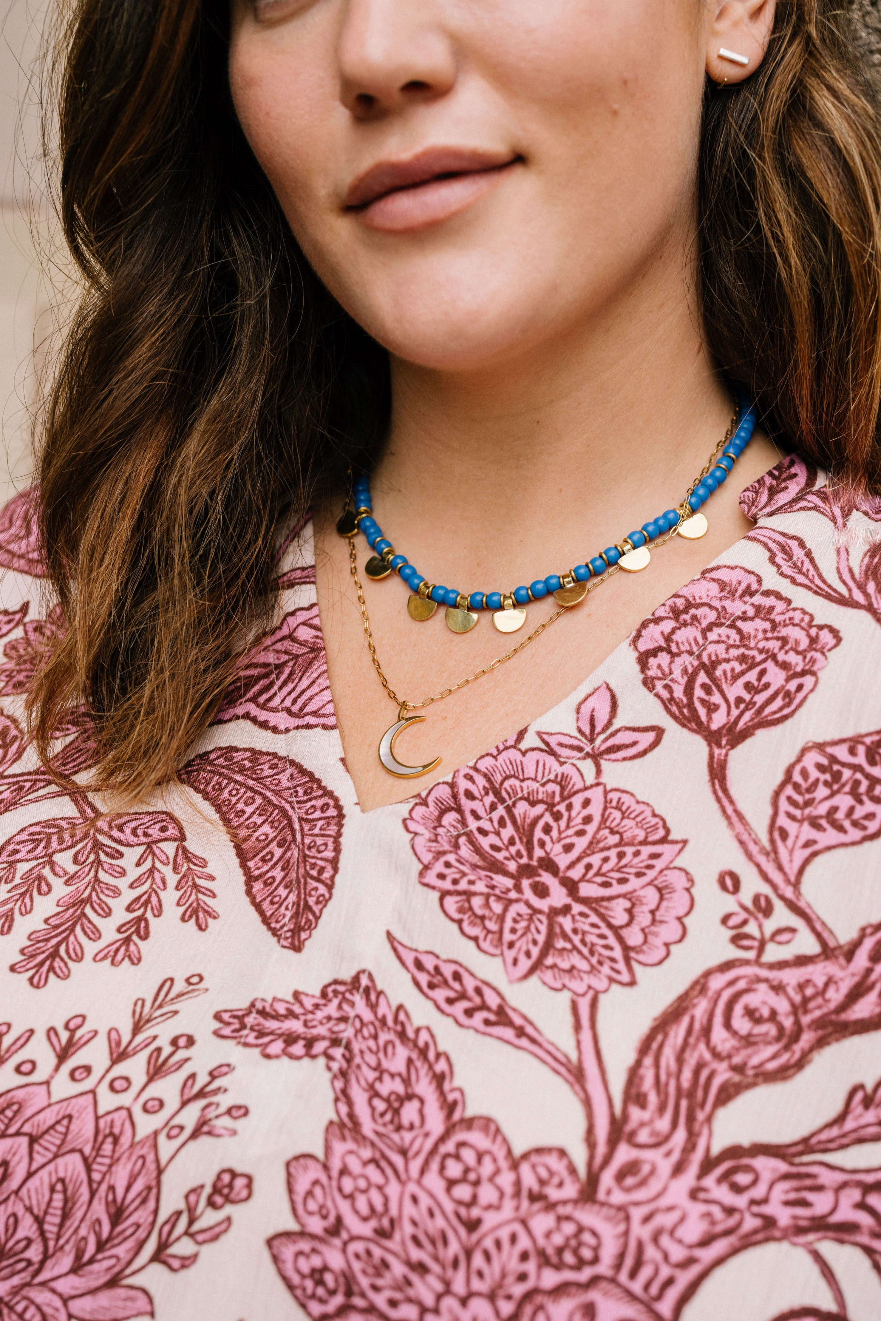 The Moonstruck Necklace is a gold chain necklace with a crescent moon shaped pendant. The pendant has a sharp, minimalist look. It is made of mother-of-pearl outlined in shining gold.