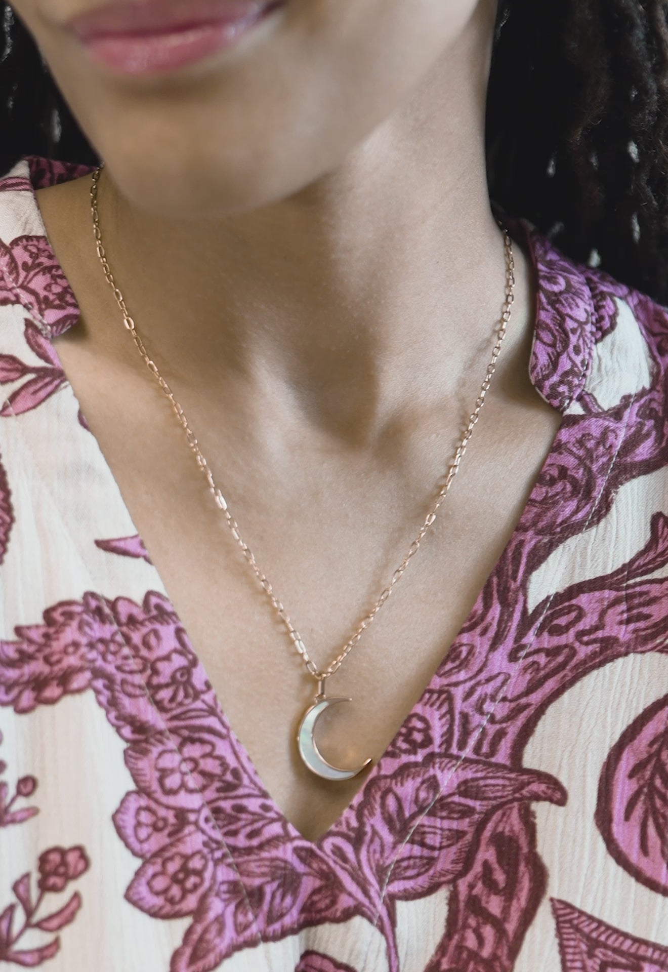 • The Moonstruck Necklace is a gold chain necklace with a crescent moon shaped pendant. The pendant has a sharp, minimalist look. It is made of mother-of-pearl outlined in shining gold.