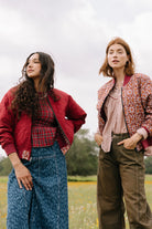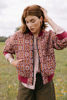 The classic bomber jacket is getting a stylish upgrade. This cool quilted bomber is fully reversible, featuring a vibrant floral ikat pattern on one side and a rich cranberry on the other. So whether you're feeling like making a bold statement or going for a modern minimalist look, this 100% cotton jacket is going to be your new best friend.