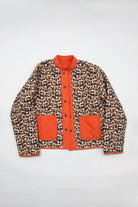 This jacket has a quilted texture and is composed of 100% cotton. The bulk of the jacket is leopard print fabric, and the collar, cuffs, button closure, and pockets are bright orange fabric. There are two large pockets that are open at the top. The jacket has black snap buttons along the front as a closure.