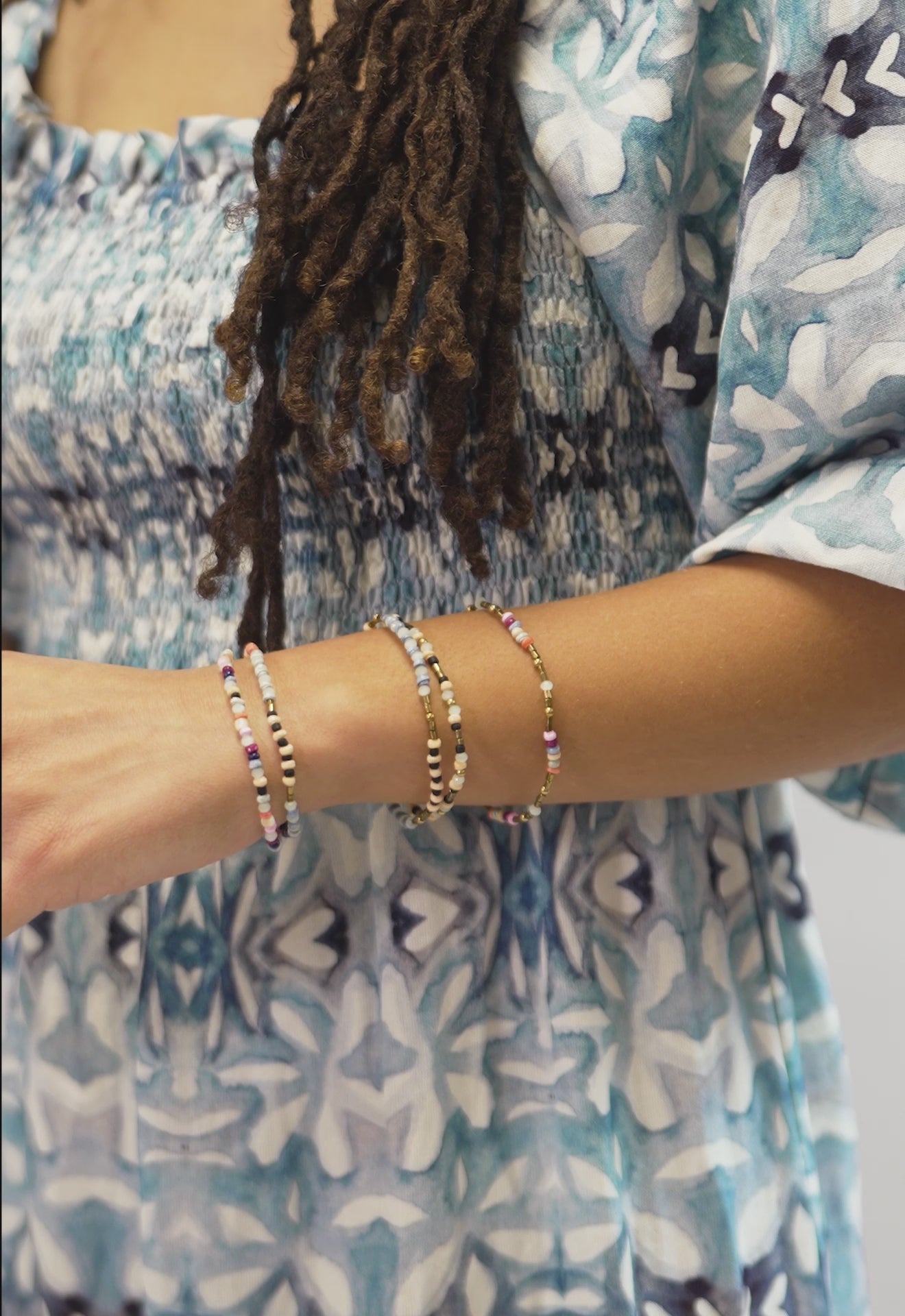 These five colorful bracelets can be worn as a coordinated stack or mixed and matched with your other Noonday favorites. Beads made of crystal, paper, copper, and mother of pearl create a unique combination of styles and shapes.