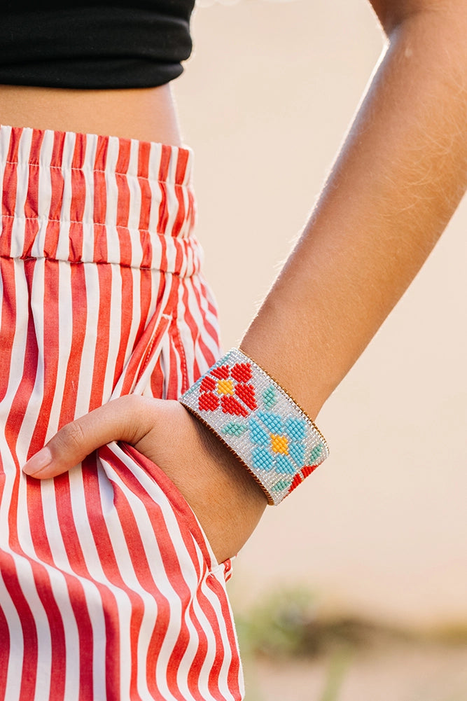 The Florecitas Cuff is a wide, flexible beaded cuff. Soft leather is stitched with hundreds of tiny glass beads to form a large floral pattern. The background of the cuff is composed of clear beads, and the flowers are red and light blue with mint green leaves.
