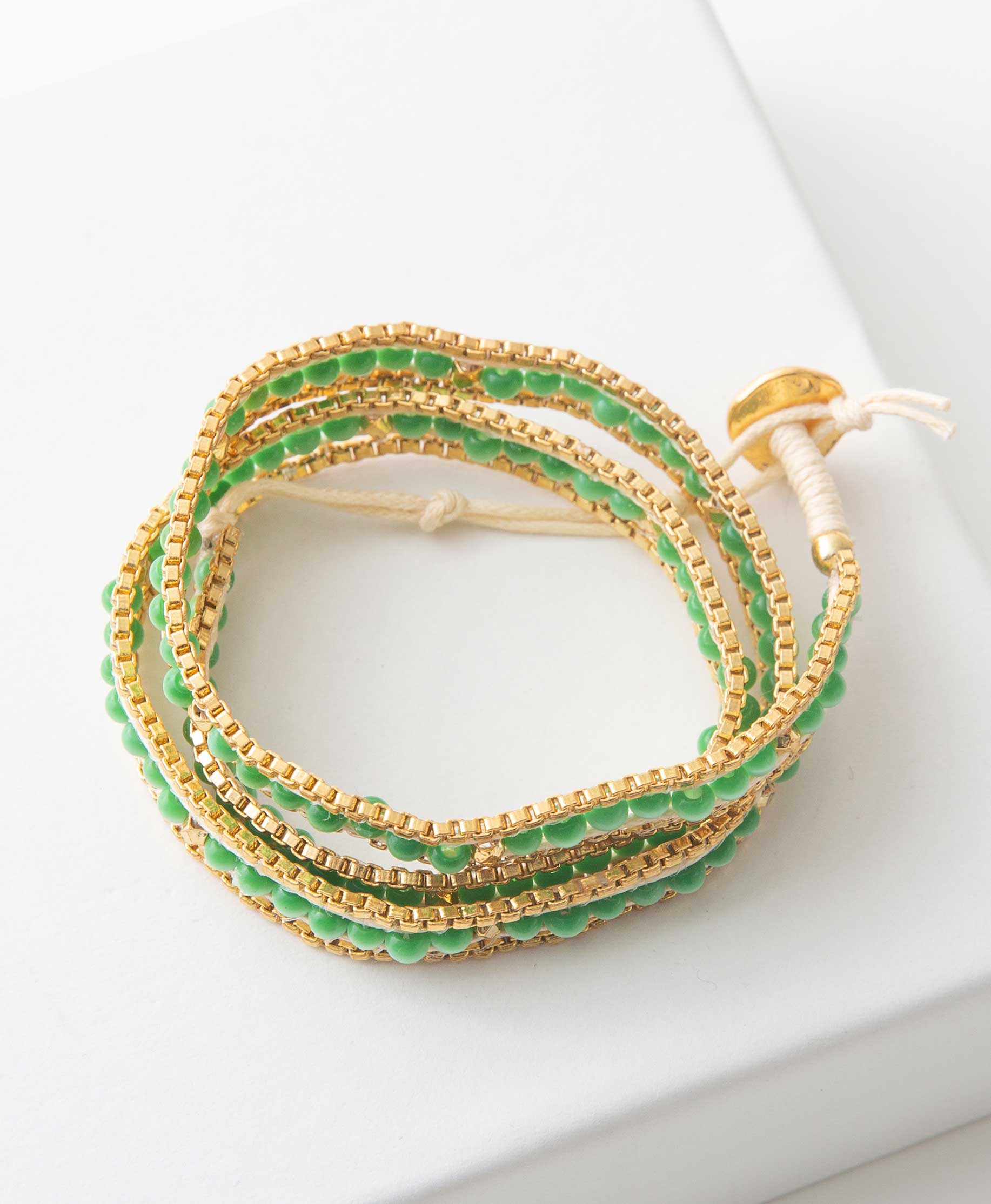 This pretty wrap bracelet features glass beads in a stunning shade of jade that we can't get enough of. The glass beads are strung between two layers of shining brass, creating an eye-catching style that can easily be adjusted for the perfect fit.