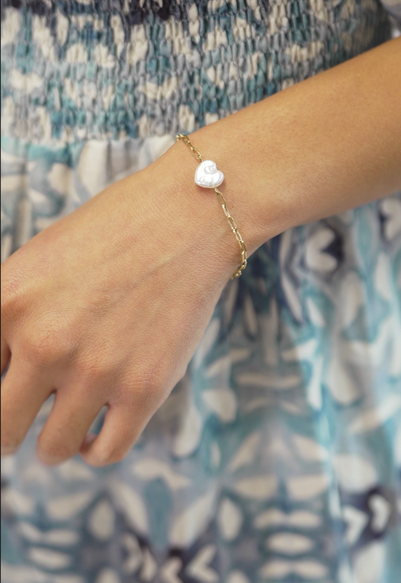 This classic gold bracelet features a heart cut from genuine freshwater pearl. The elongated link chain is crafted from 14k gold plated stainless steel and can be adjusted to fit a variety of wrist sizes.