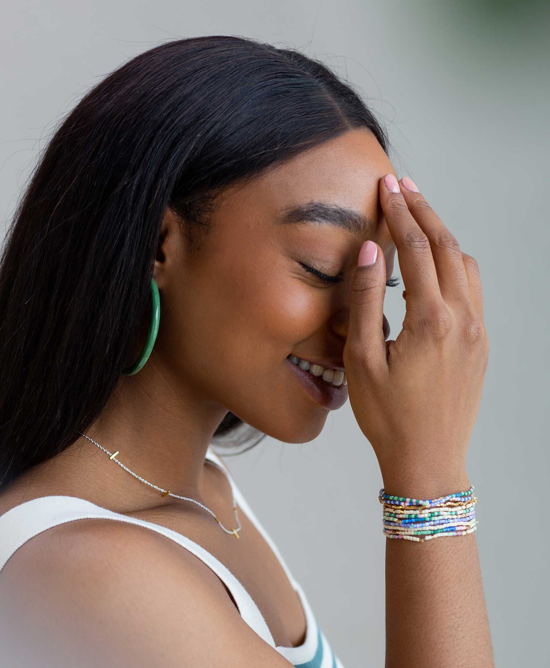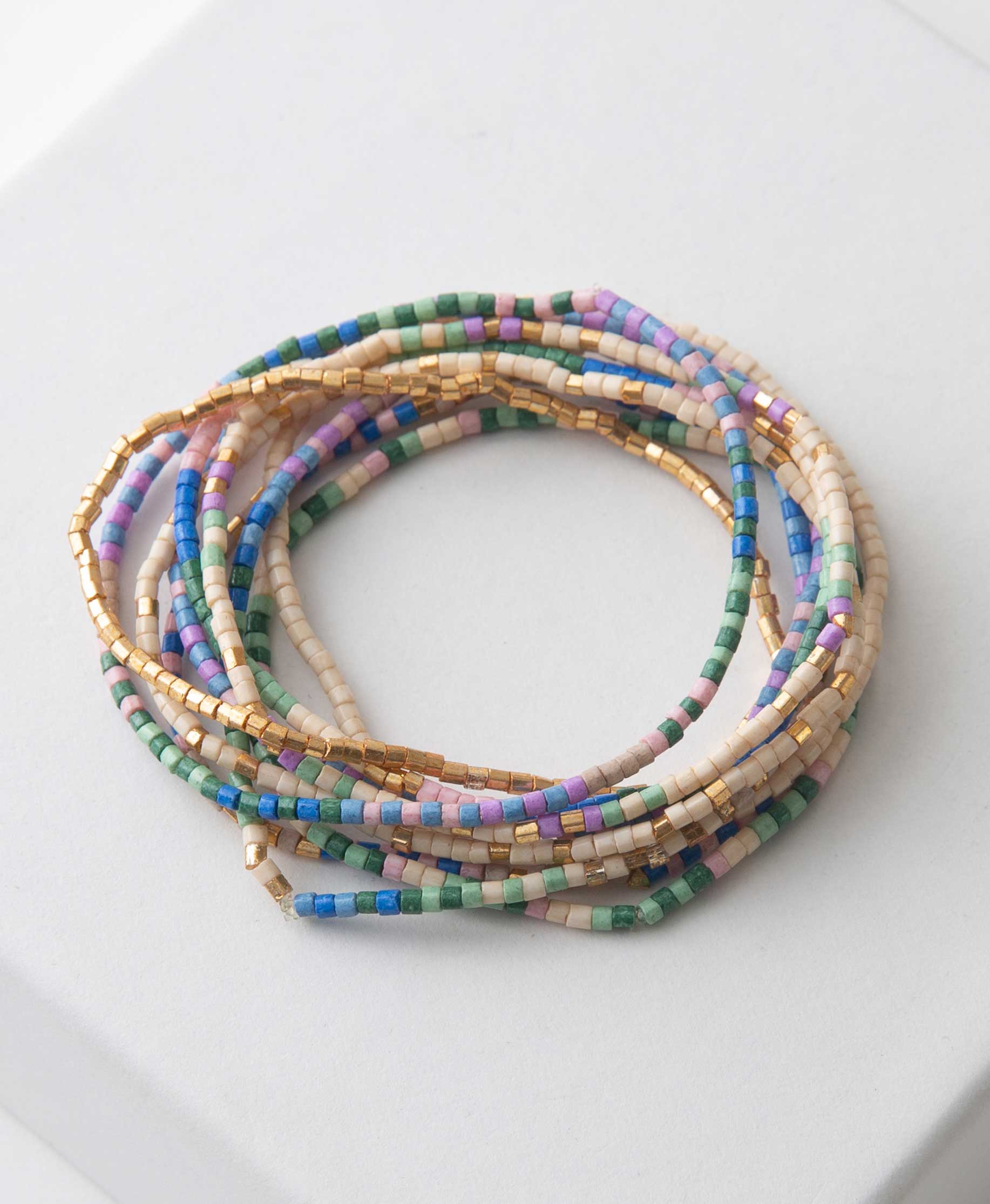Get ten beautiful bracelets in one with this curated stack! Glass beads in an array of soft shades are strung to create these stretchy bracelets. Customize your look by wearing them piled together or pairing them with other Noonday arm party favorites!
