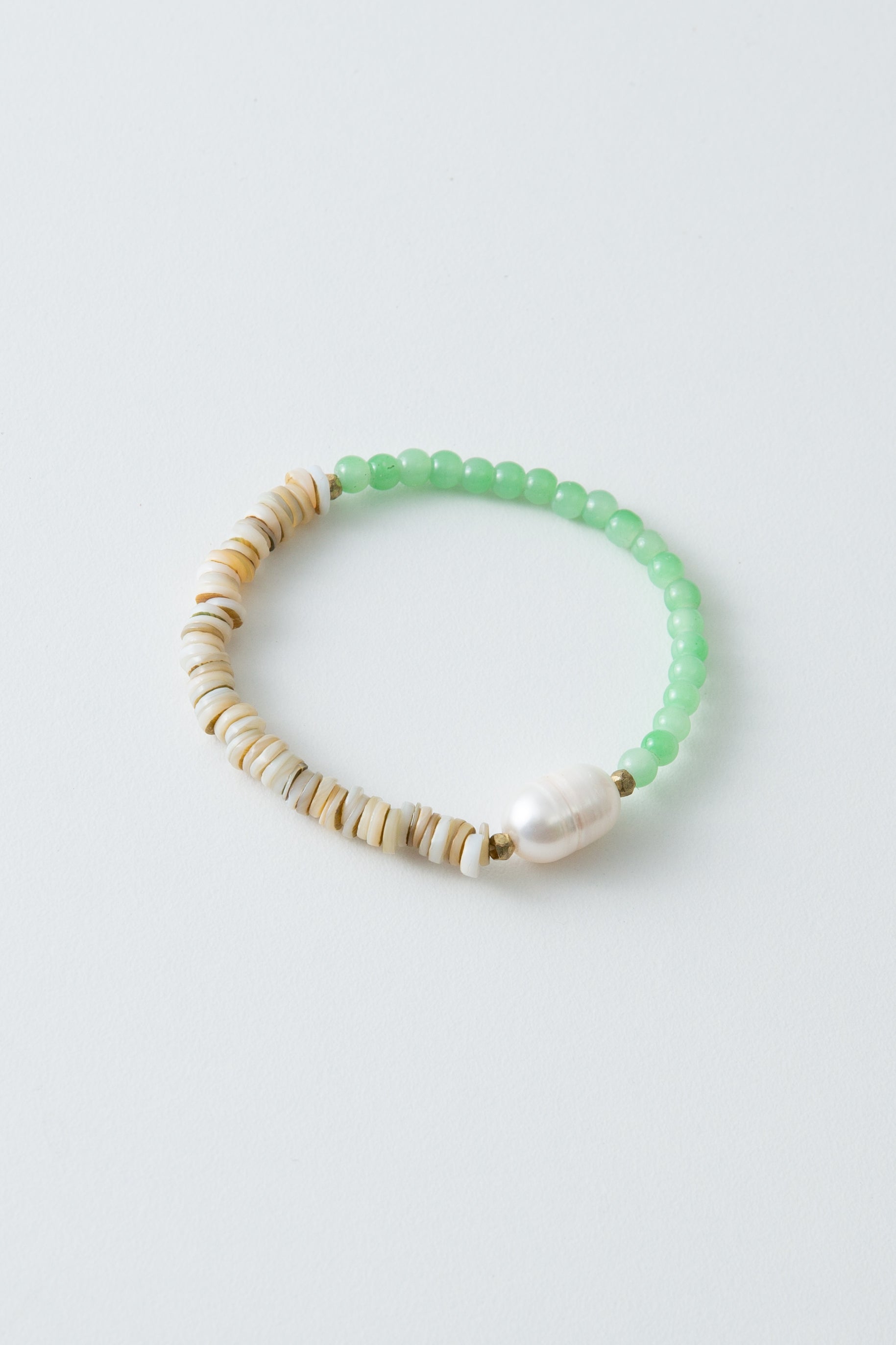Add a sweet pop of color to your arm with the Pastel Pearl Bracelet, crafted with sea green Glass Beads, a lustrous Pearl, and a shell beads from India. Perfect for any occasion, this unique bracelet adds the perfect touch of color to any outfit.
