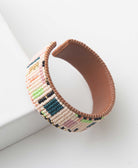 This stylish cuff has a sustainable secret-it's crafted using upcycled PVC pipes! Our Artisan Partners in Guatemala got creative to design this beautiful style. They handweave dainty glass beads into a pattern inspired by traditional motifs, then stitch the beaded piece onto soft, caramel-colored leather.