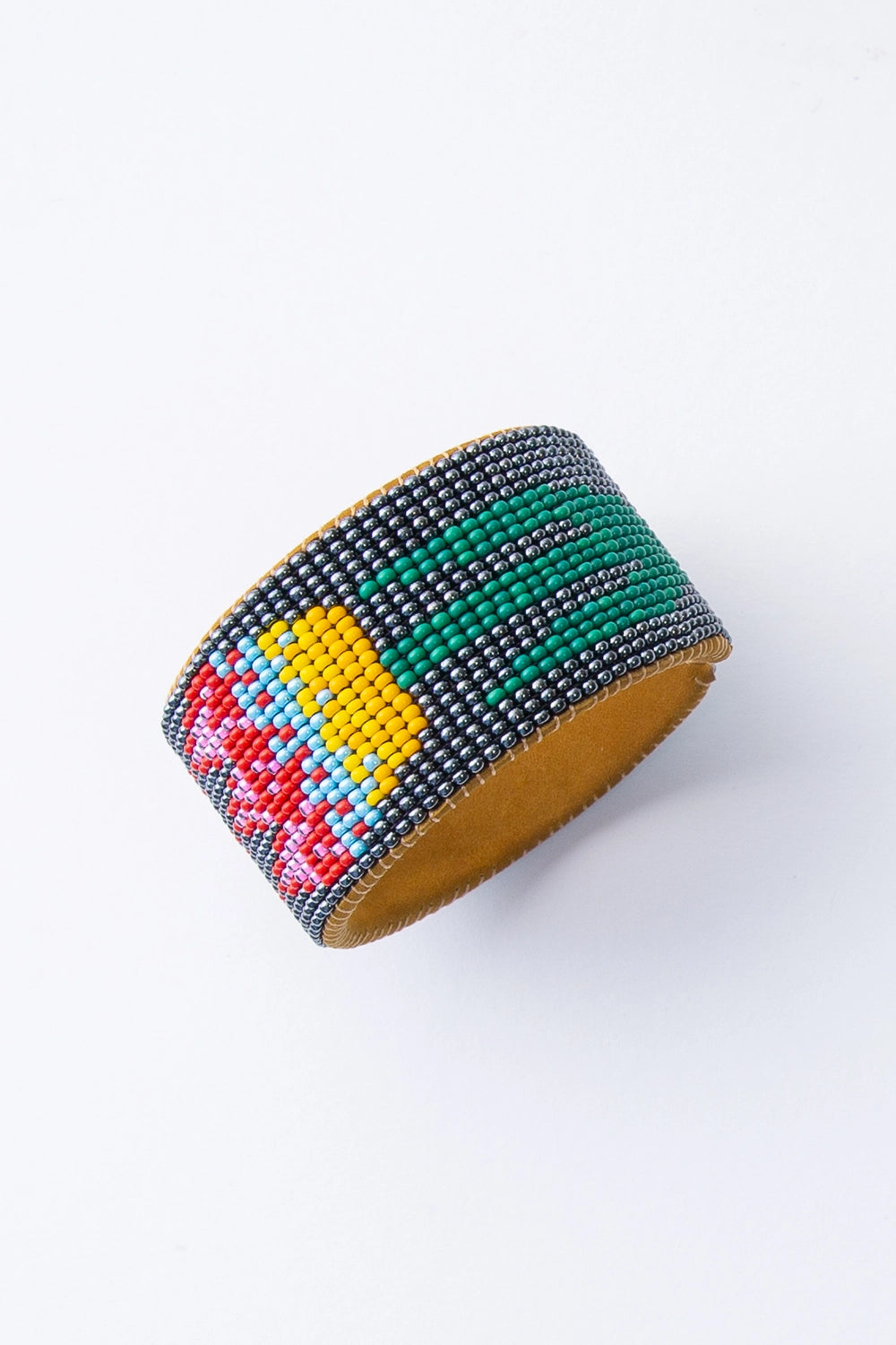 Glass beads and metallic accents on leather