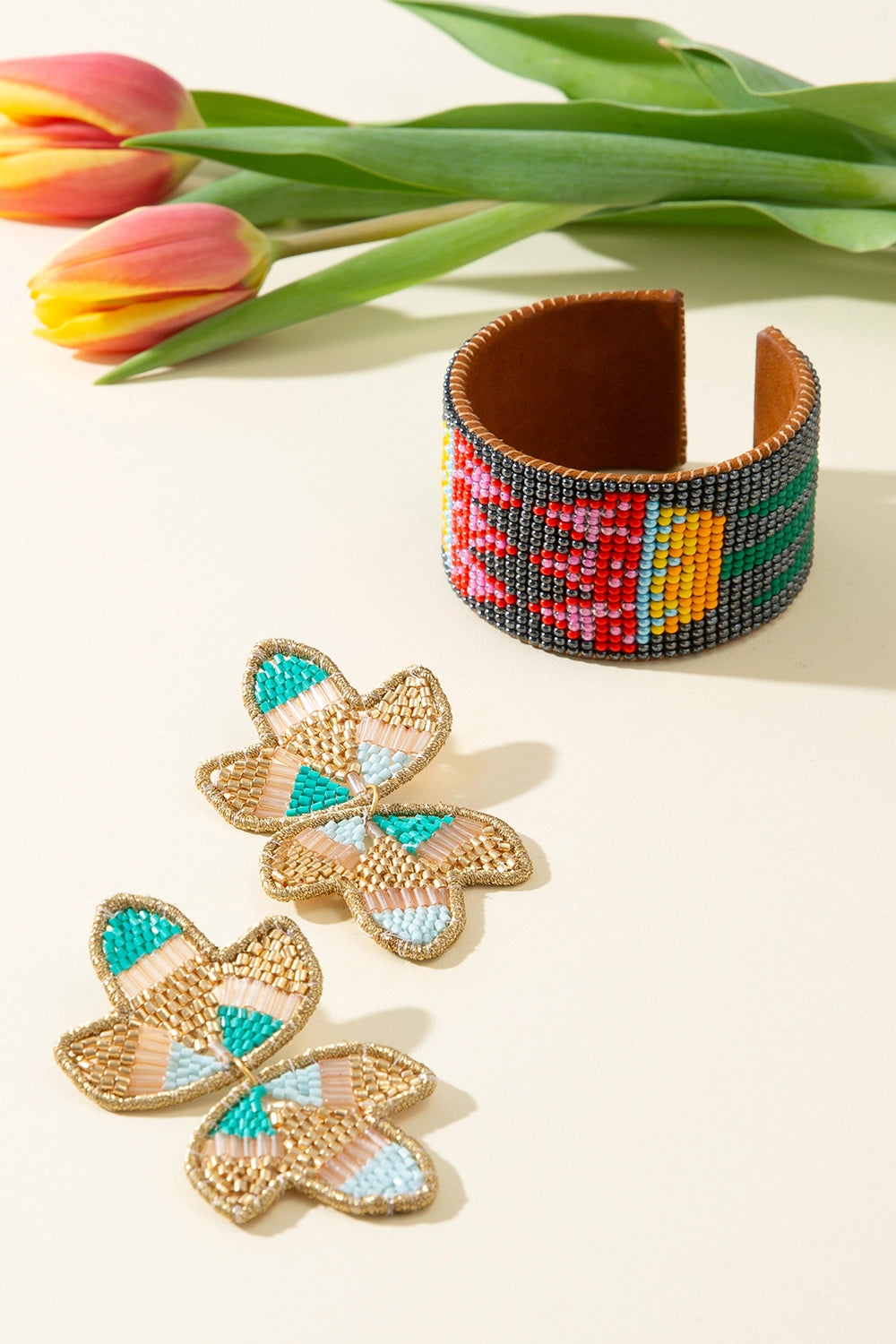 This beaded cuff features a delicate tulip motif—an enduring symbol of renewal, love, and new beginnings. Handcrafted by artisans, each bead is placed with care, creating a piece that feels both meaningful and timeless.