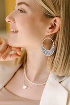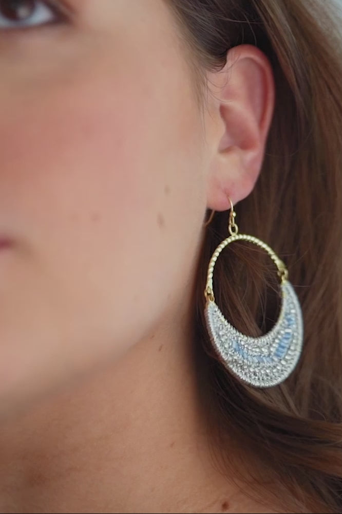 Our Moonlight Earrings are the perfect lightweight silver and gold hoop. A shining gold plated brass hoop is accented with a crescent of metallic silver thread known as kasab thread, beloved in India for its sparkling quality. Light blue glass beads complete the look, adding some subtle color inspired by the moonlit sky.