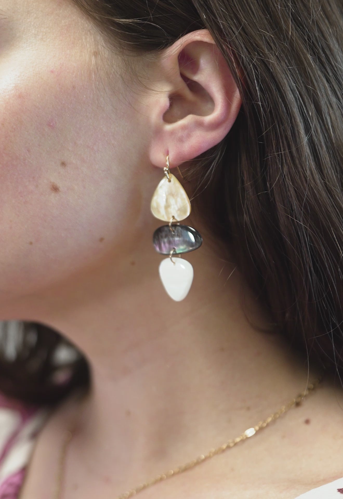 Shining pieces of natural shell in hues of cream, silver, and white are stacked for a structural statement pair. The neutral color palette allows these earrings to be worn with any look with ease.