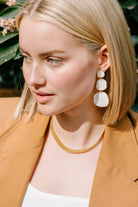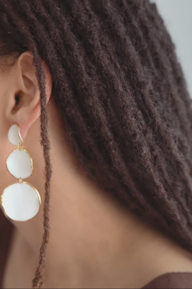 These stacked white chandelier earrings are made of smooth porcelain discs that sway as you move. Each disc is finished in a ring of gleaming gold for some subtle shine. The neutral statement earrings feature a stainless steel post, making them perfect for sensitive ears.