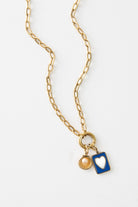 The Trust Charm is a rectangular charm composed of blue enamel. There is a heart-shaped cut-out in the center. The charm is outlined in gold and hangs from a gold ring.