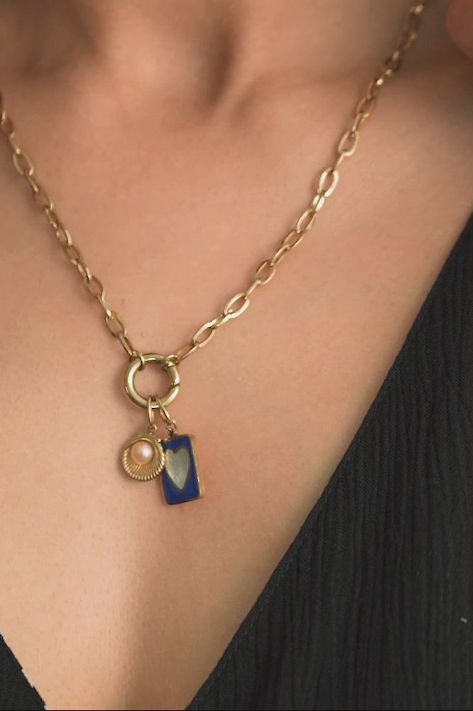 • The Trust Charm is a rectangular charm composed of blue enamel. There is a heart-shaped cut-out in the center. The charm is outlined in gold and hangs from a gold ring.