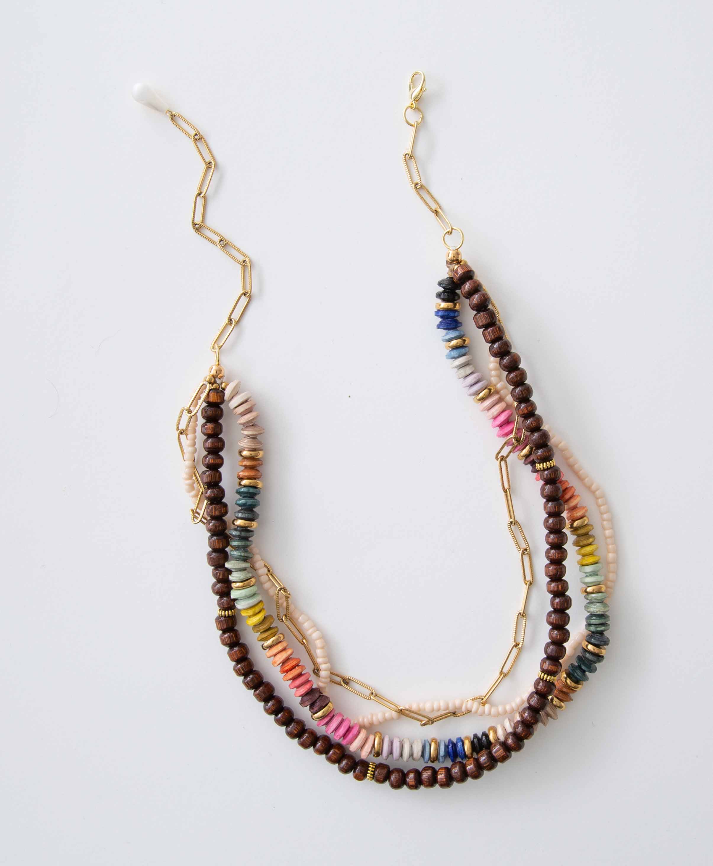 Get the multi layered look with just one must-have necklace. Strands of multicolored paper beads, brass, wood, and gleaming mother of pearl are layered together for a boho inspired accessory. The elegant gold chain gives this multi-stranded necklace a classic feel.