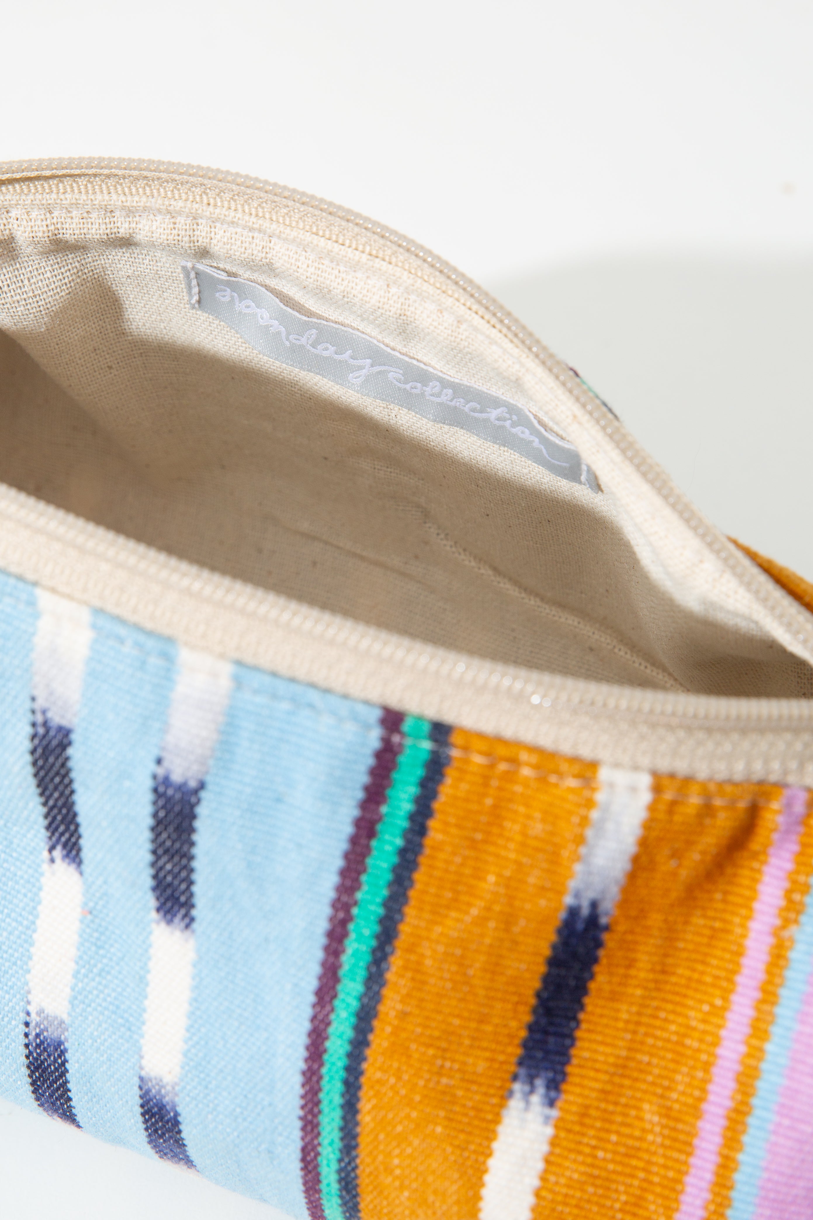 • This is a tubular shaped pouch composed of brightly patterned woven cotton. The pouch is wider than it is tall. A zipper stretches along the top of the pouch. The fabric features stripes of mustard yellow, light blue, aqua, pink, and navy, as well as stripes with a traditional ikat pattern.