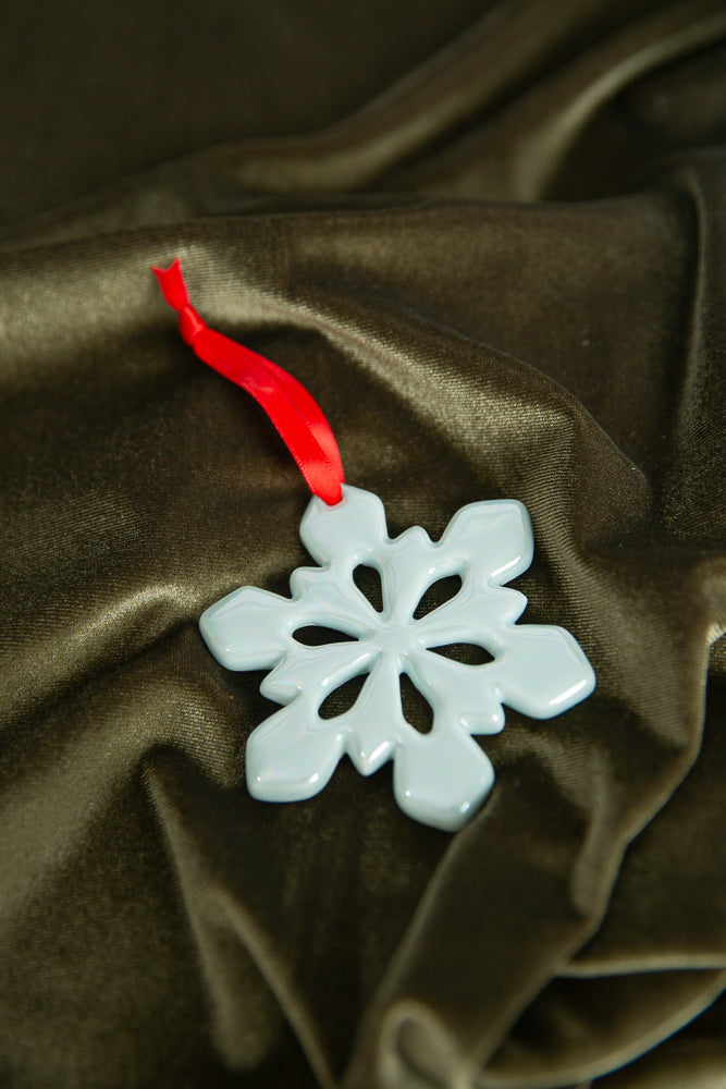 This handmade porcelain snowflake ornament is pure winter wonderland. A classic Christmas ornament with elevated beauty, this iridescent snowflake is a one-of-a-kind addition to your tree or garland.