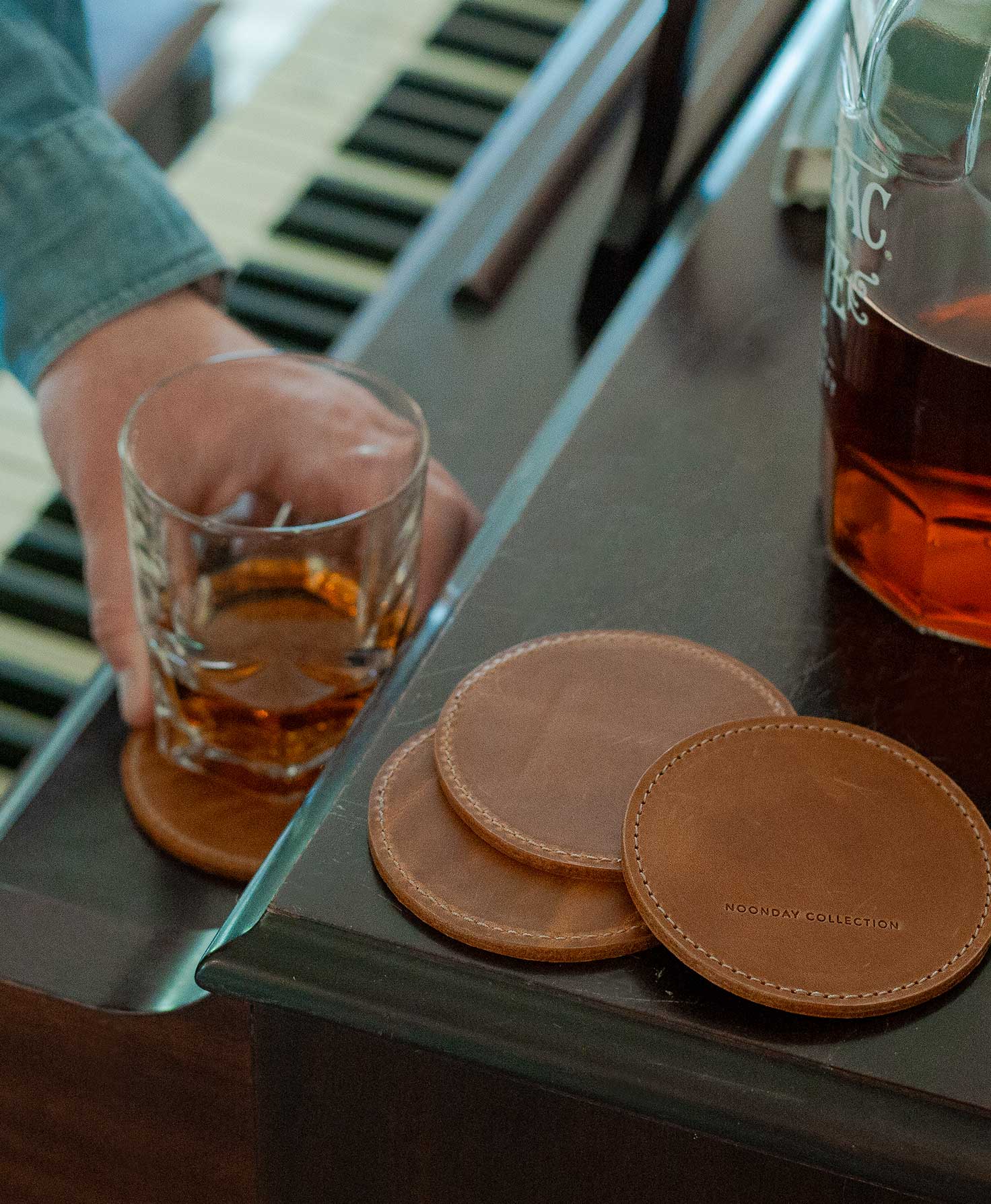 Leather is a permeable material that will absorb water, so it is a good idea to wipe down your leather coasters after each use to maintain healthy leather.