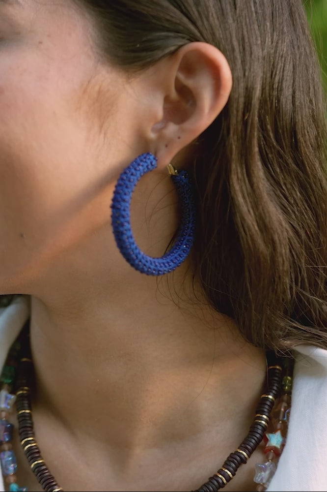 Make a vibrant statement with these crocheted hoop earrings that sparkle in a deep blue hue. Our Artisan Partners combine multiple craft techniques to create these beautiful blue hoops inspired by the ocean's depths.