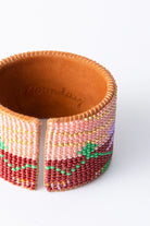 Glass beads that capture the beauty of the sand dunes at sunset are woven into a southwest-inspired pattern, then wrapped around a soft leather cuff. This wide floral bracelet is flexible and perfectly fits a variety of wrist sizes.
