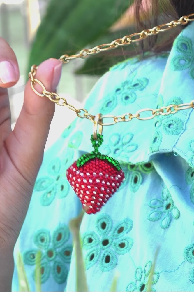 • The Fresca Necklace has a gold chain with elongated links that vary in size. At the base of the necklace is a three-dimensional strawberry pendant composed entirely of translucent glass beads.