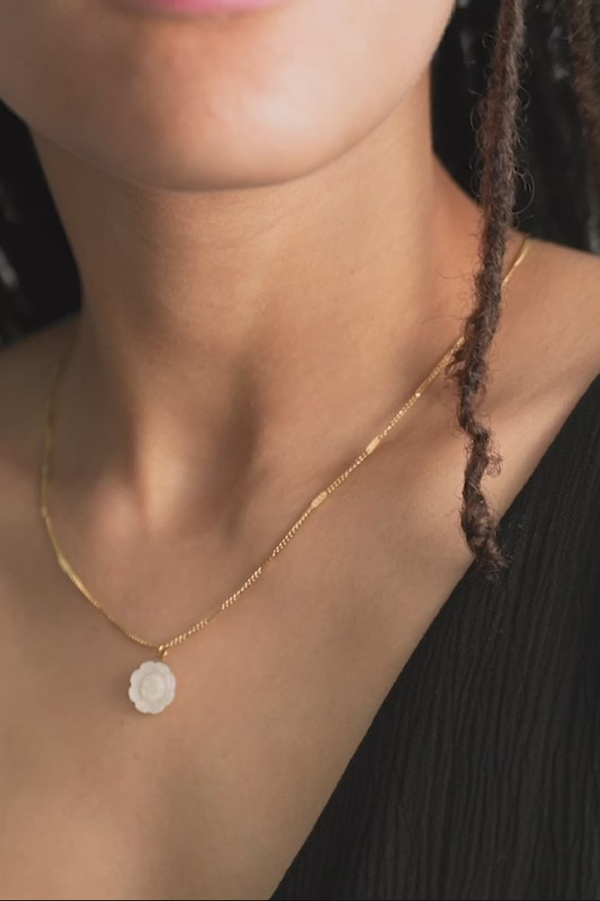 This 14K gold plated stainless steel necklace is adorned by a beautiful mother of pearl pendant in a sweet floral shape. The dainty and feminine gold chain necklace is the picture of everyday elegance with its classic cream and gold color palette and nature-inspired shape. Each necklace is handcrafted by women in East Asia whose work as jewelry-makers is empowering them to overcome exploitation--and truly bloom.