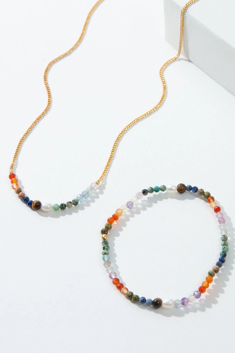 Bring a parade of pearls and semi-precious stones to your jewelry collection with the stunning Refraction Necklace, handcrafted by skilled artisans in India. Dainty beads in a vibrant mix of colors, materials, and textures are thoughtfully arranged along a gold-plated brass chain for a look that feels both playful and refined. Lightweight and versatile, this beaded necklace can be worn alone for a subtle pop of color or layered with your favorite chains for added dimension.