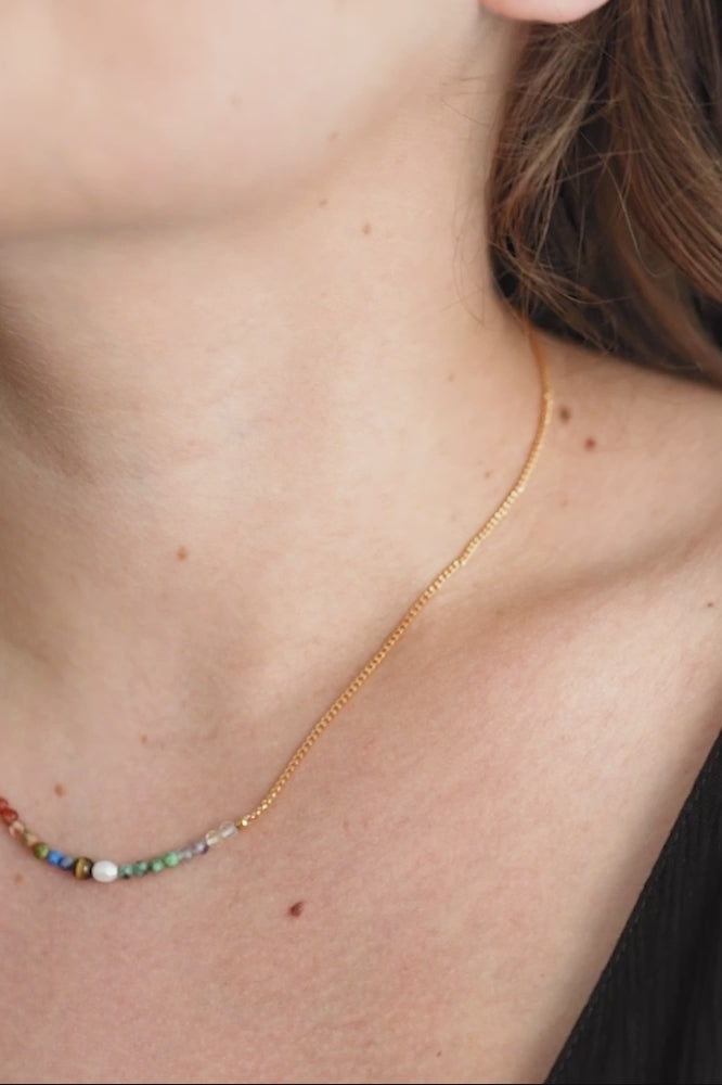 Bring a parade of pearls and semi-precious stones to your neck with our stunning Refraction Necklace, handcrafted in India. Dainty beads in a rainbow of colors, materials, and textures adorn a gold plated brass chain. This versatile necklace can be worn alone or as part of a layered look.