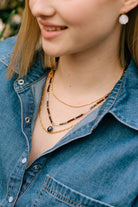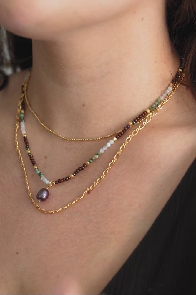 The Sharma Necklace is a three-stranded necklace. The shortest strand is composed of small gold beads. The middle strand is composed of semi-precious stone, quartz, and wood beads with a dark pearl charm. The longest strand is a gold metal chain.