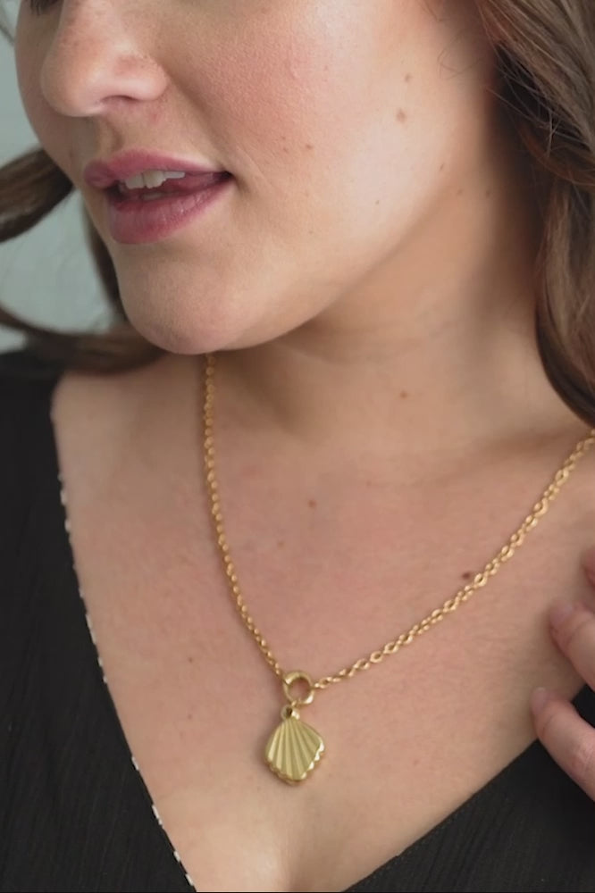 This art deco-inspired gold charm locket captures the simple beauty of the sea. A stylized shell charm crafted from 14k gold plated stainless steel dangles from a dainty gold chain. The charm can be opened, making it the perfect hiding place for a small image you want to keep close to your heart.