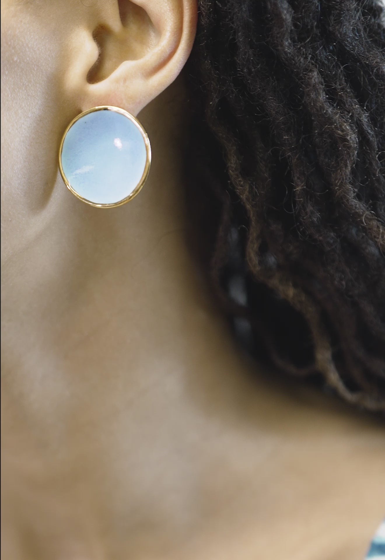 A smooth circle of indigo-hued porcelain is outlined in gleaming gold. The surgical steel posts make these elegant studs perfect for sensitive ears.