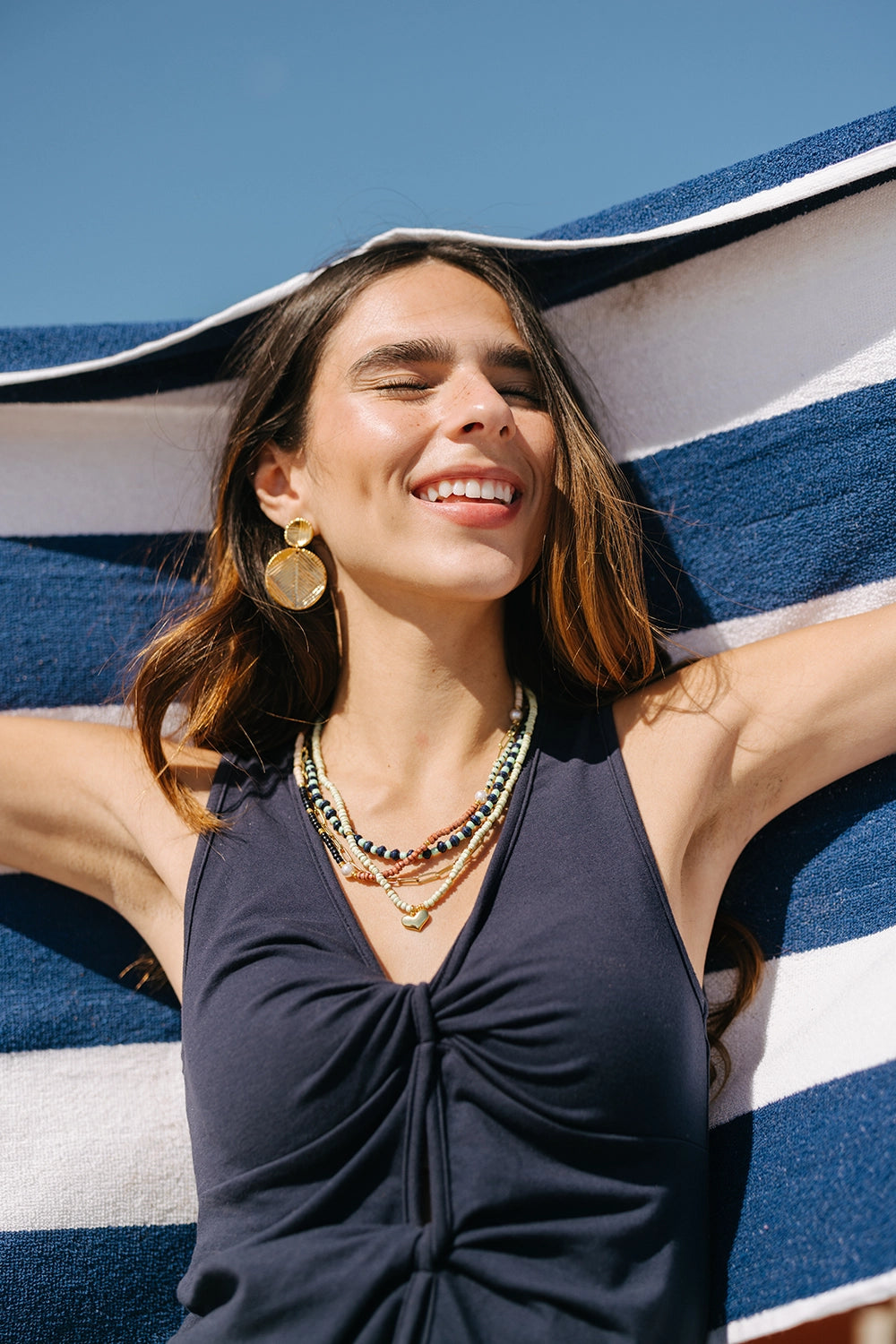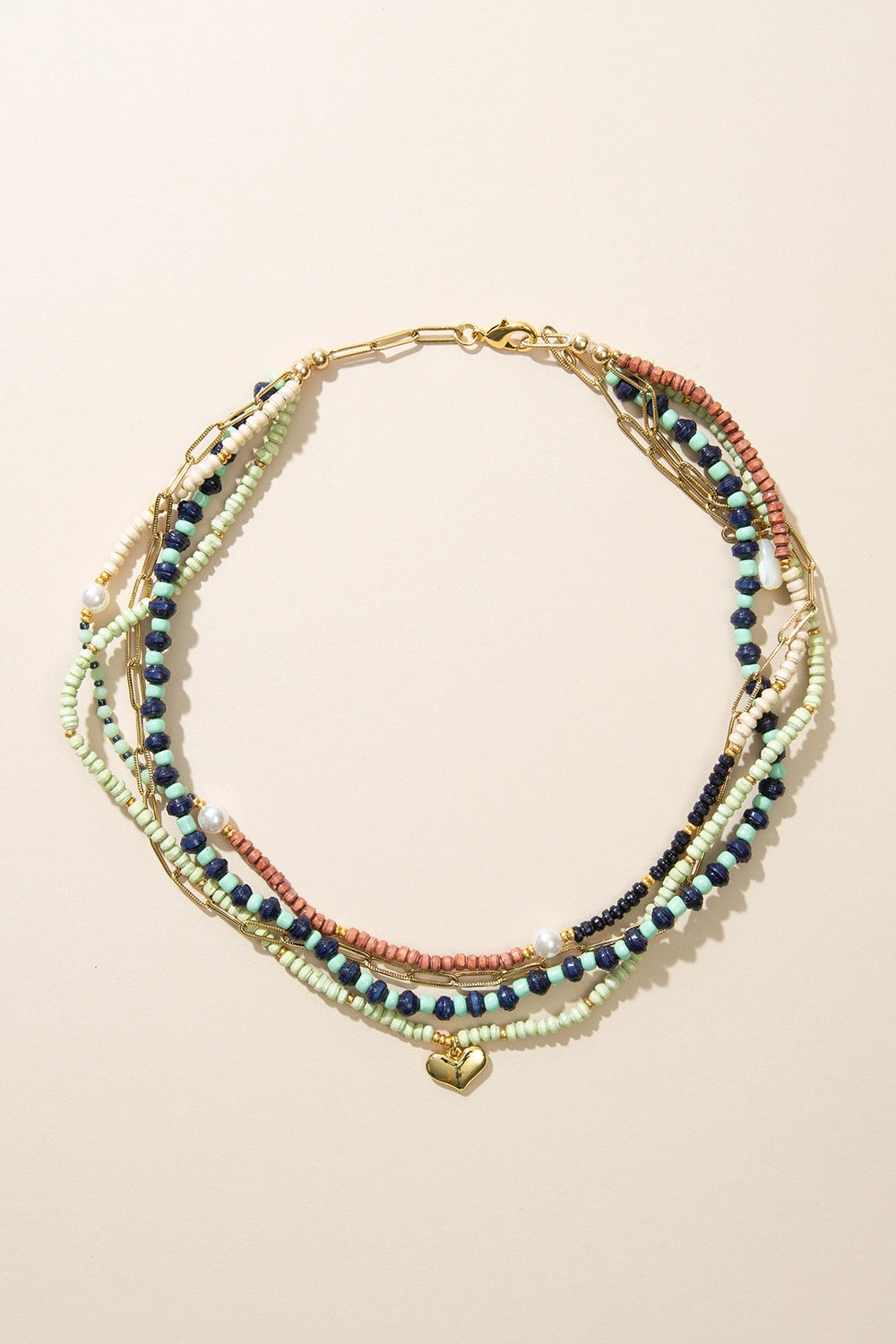 Four layers, one effortless look. The Kindred Heart Necklace is a curated stack designed to give you that perfectly layered style in a single, easy-to-wear piece. Featuring a mix of handmade paper beads, glass beads, luminous pearls, and gold-plated brass, this necklace blends color, texture, and shine into one beautifully balanced statement.