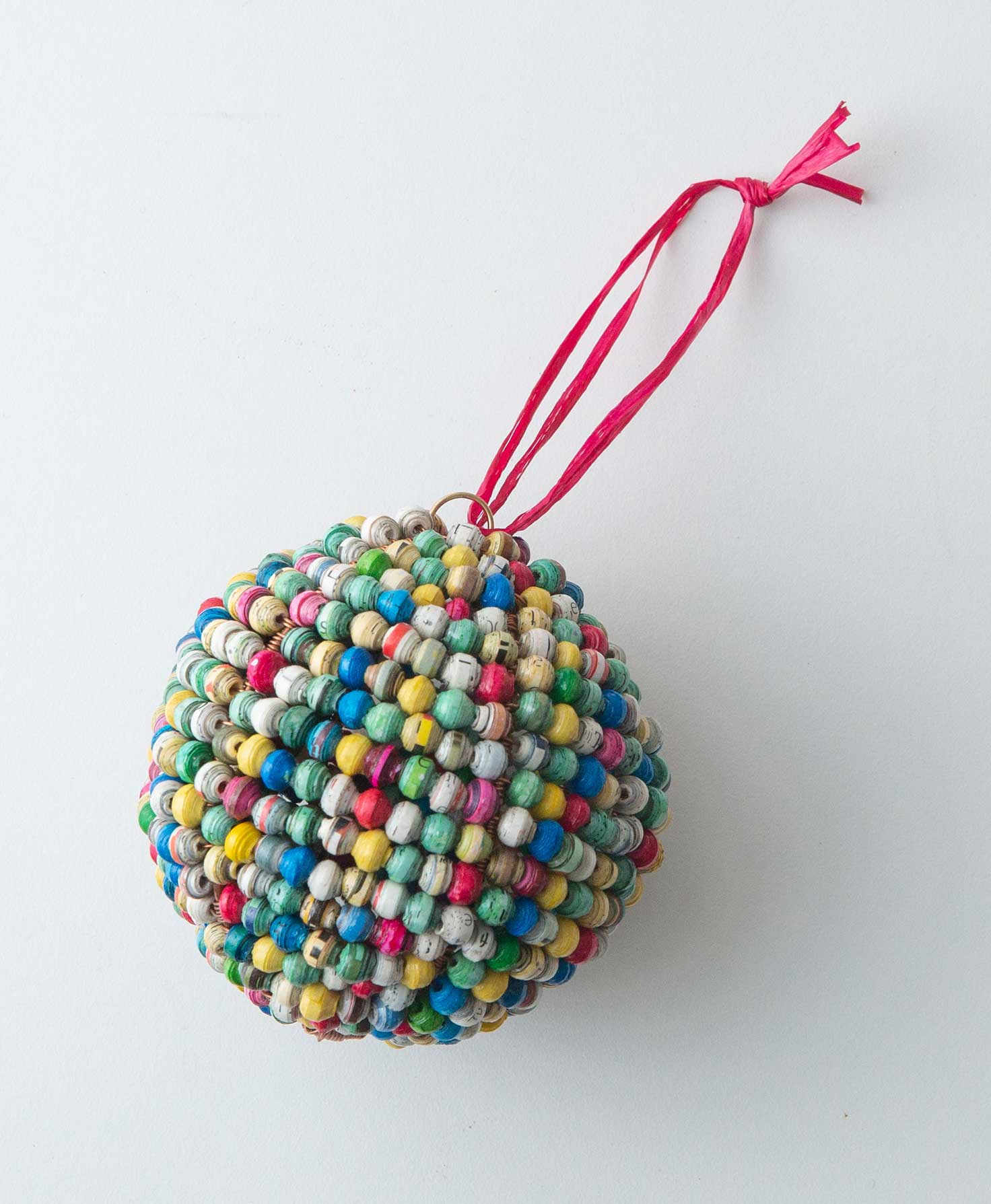 The classic Christmas bauble gets a globally inspired update with this festive ornament! Rows and rows of multi-colored paper beads wrap around to form an organic sphere-shaped adornment that looks great on or off the tree.