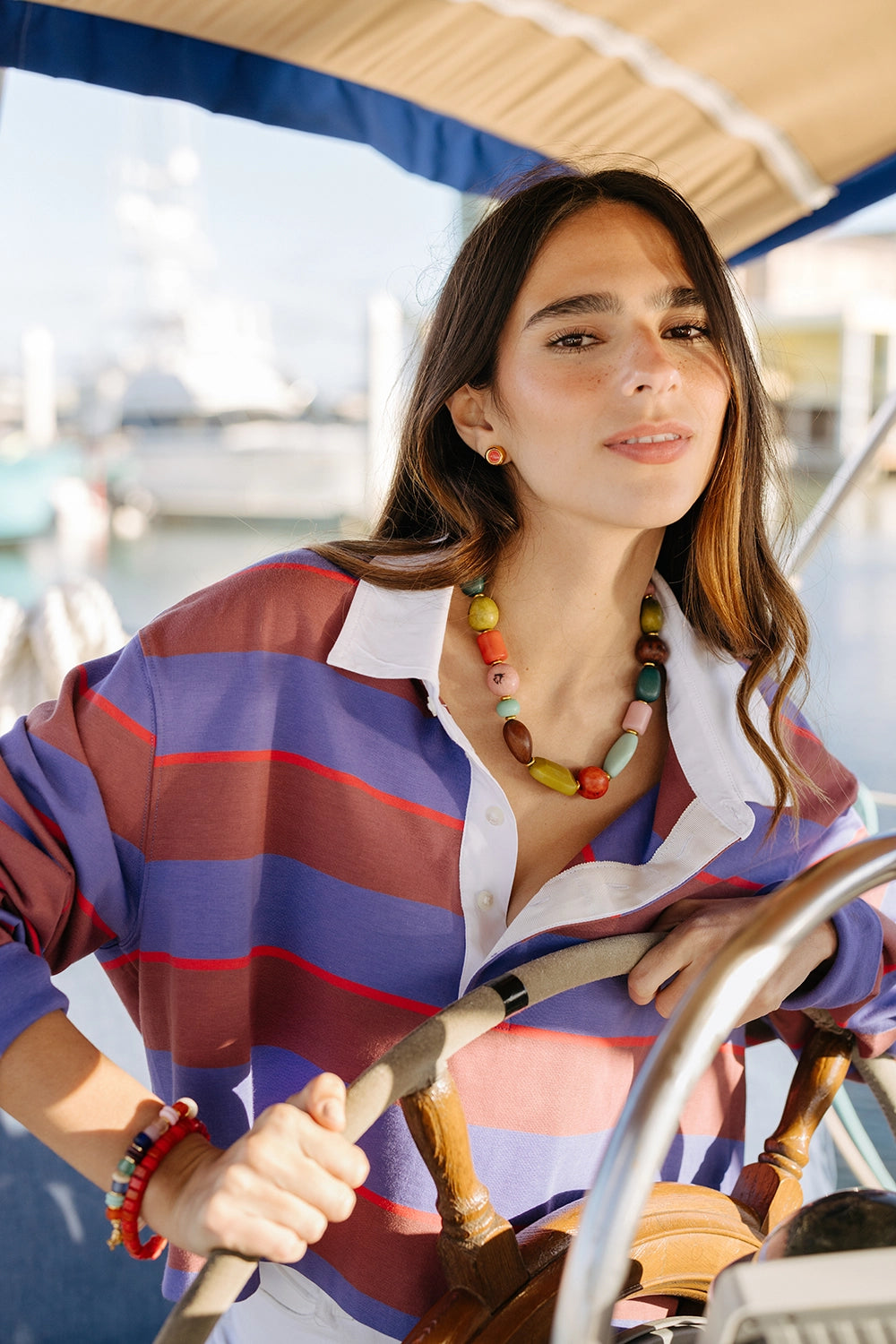 Lightweight yet striking, the Sabrosa Necklace adds instant personality to simple tops and flowing dresses alike. The mix of warm neutrals and vibrant tones makes it easy to style, whether you’re dressing up or keeping it casual.