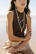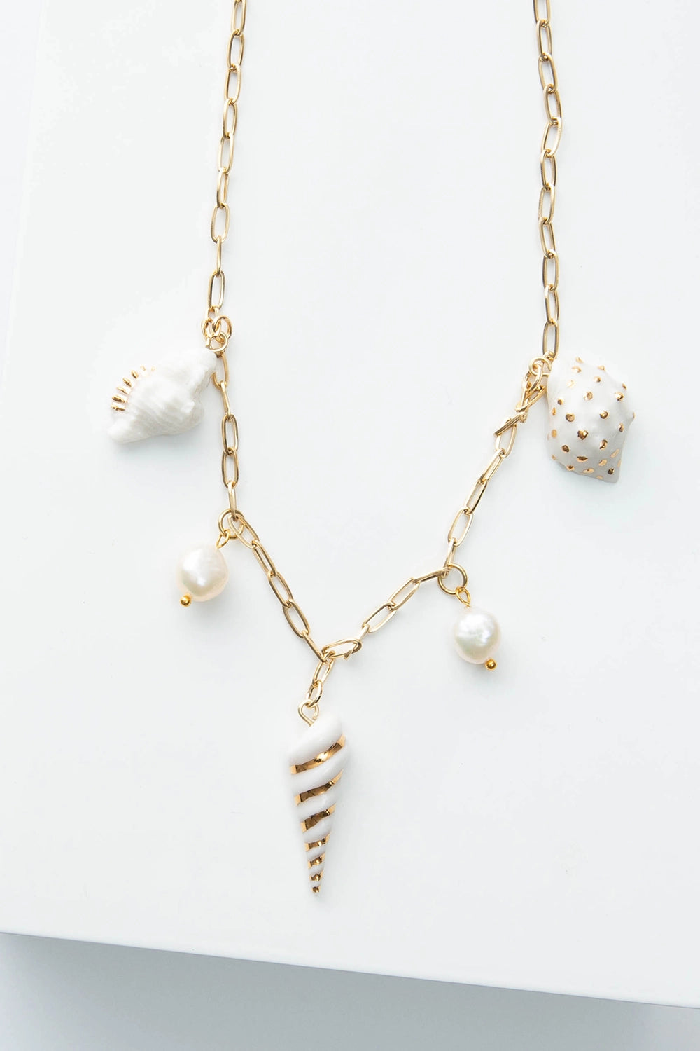Each charm adds its own story—textured shells, glossy pearls, and a spiral drop that catches the light—creating a layered, collected feel in one easy necklace. Designed to be worn solo or stacked, this piece brings soft coastal energy to everything from casual tees to breezy dresses.