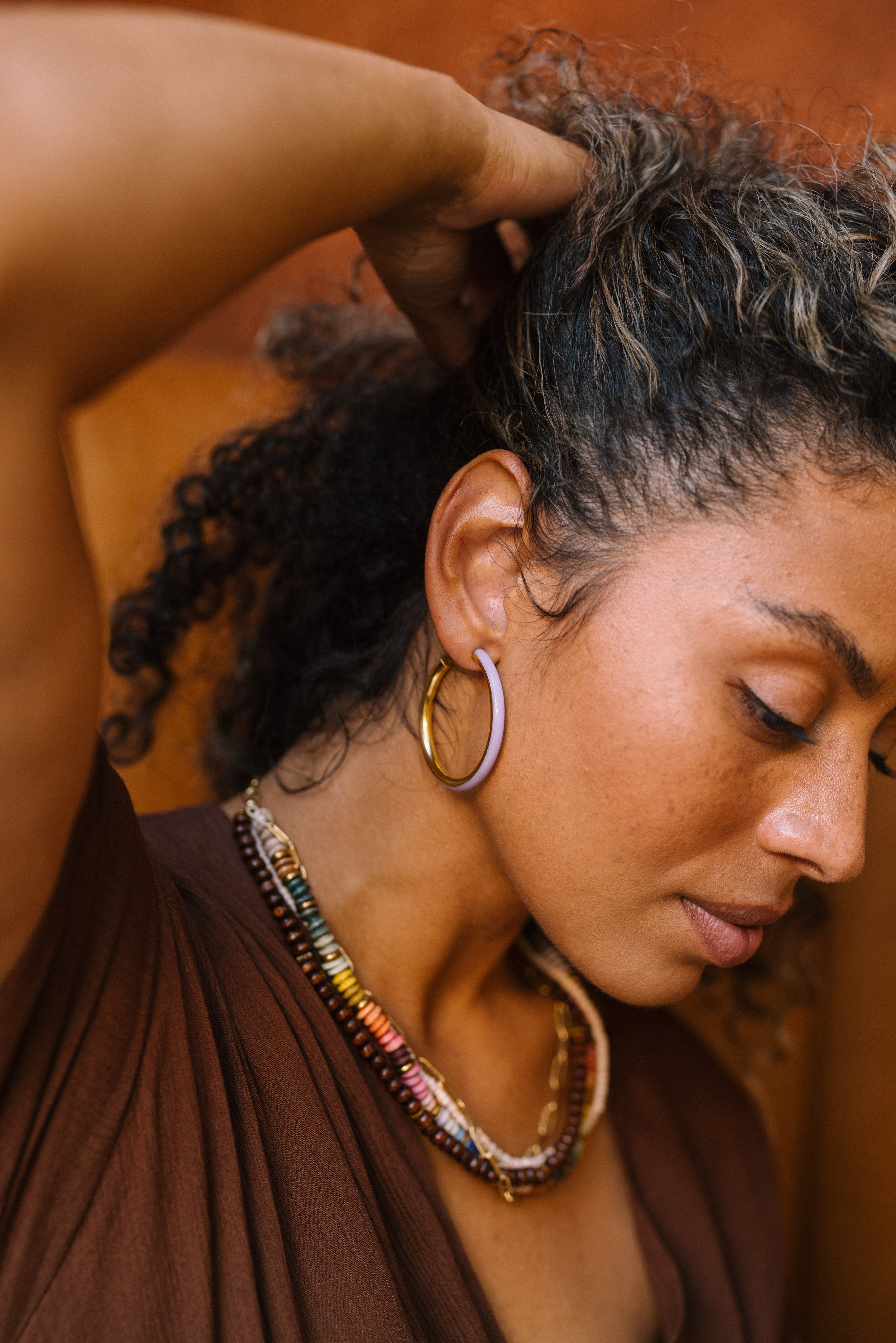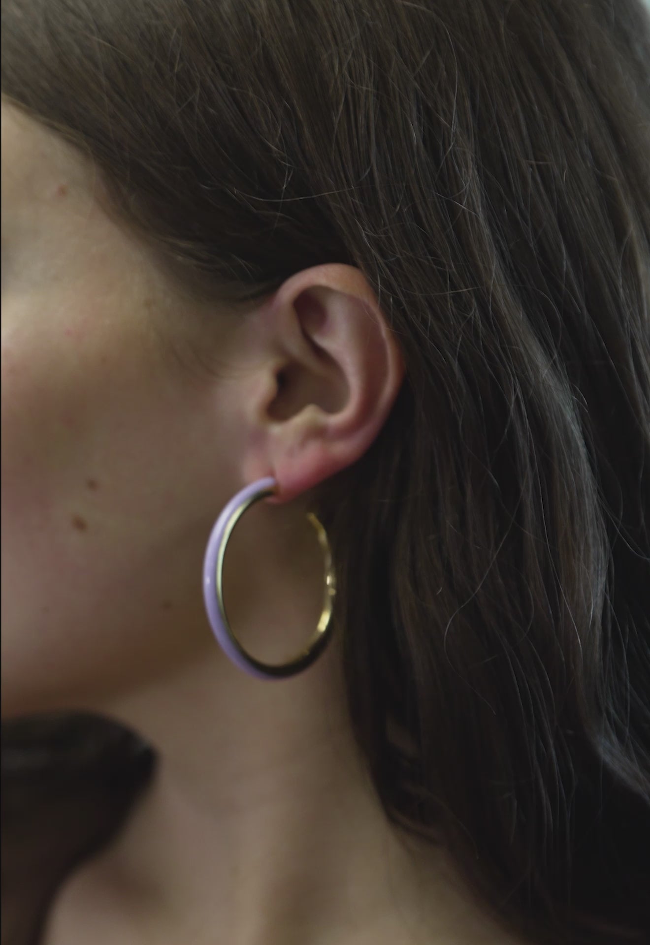 Classic large gold hoops are embellished with smooth lavender resin for a contemporary update to a beloved style. Made by master metalworkers in Peru, these tubular hoop earrings are crafted from gold plated bronze and gold plated silver, making them gentler on sensitive ears.