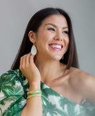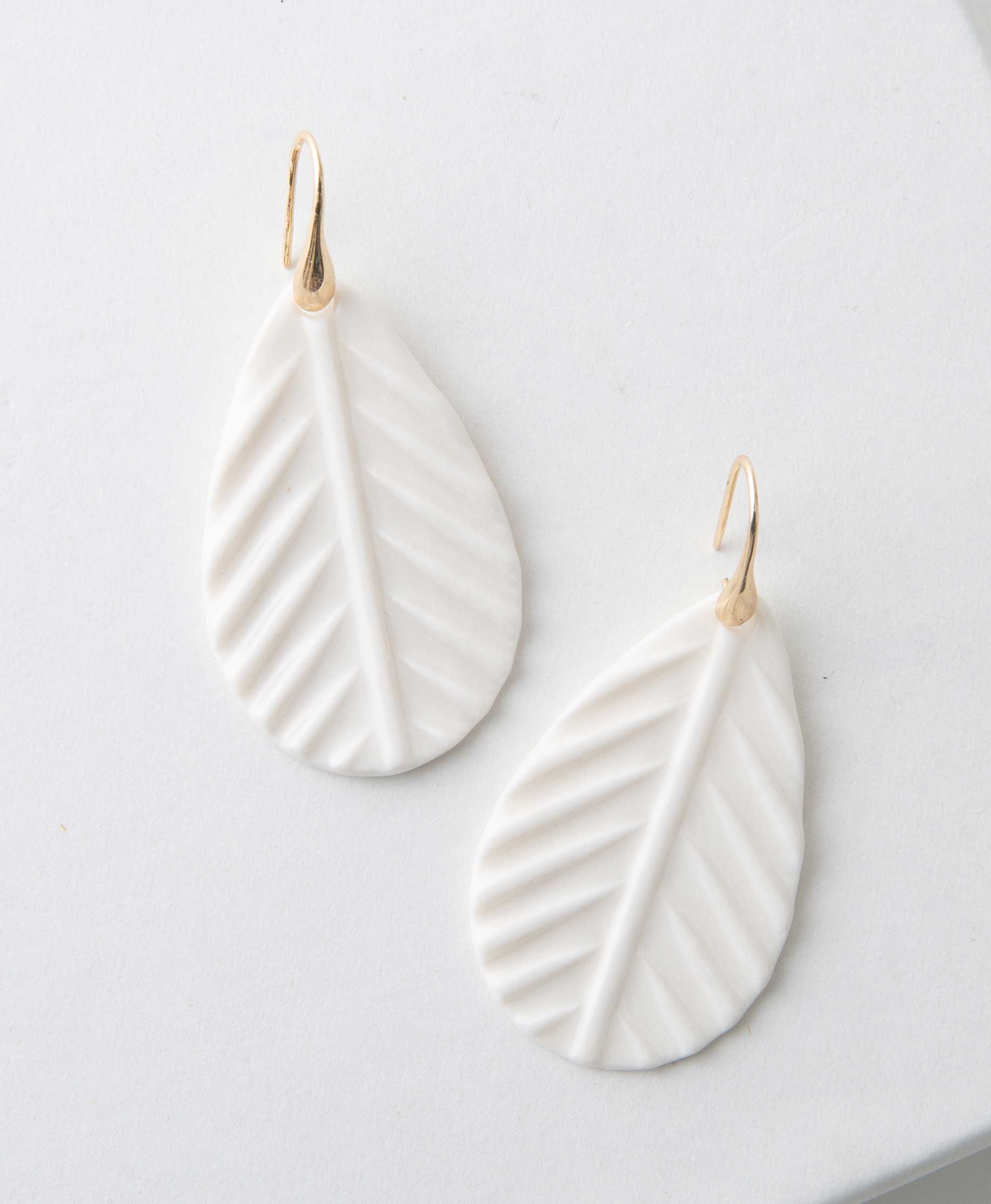 These elegant teardrop earrings are composed of smooth molded porcelain hanging from shining gold plated brass ear hooks. The feather silhouette gives this neutral pair a touch of whimsical beauty.