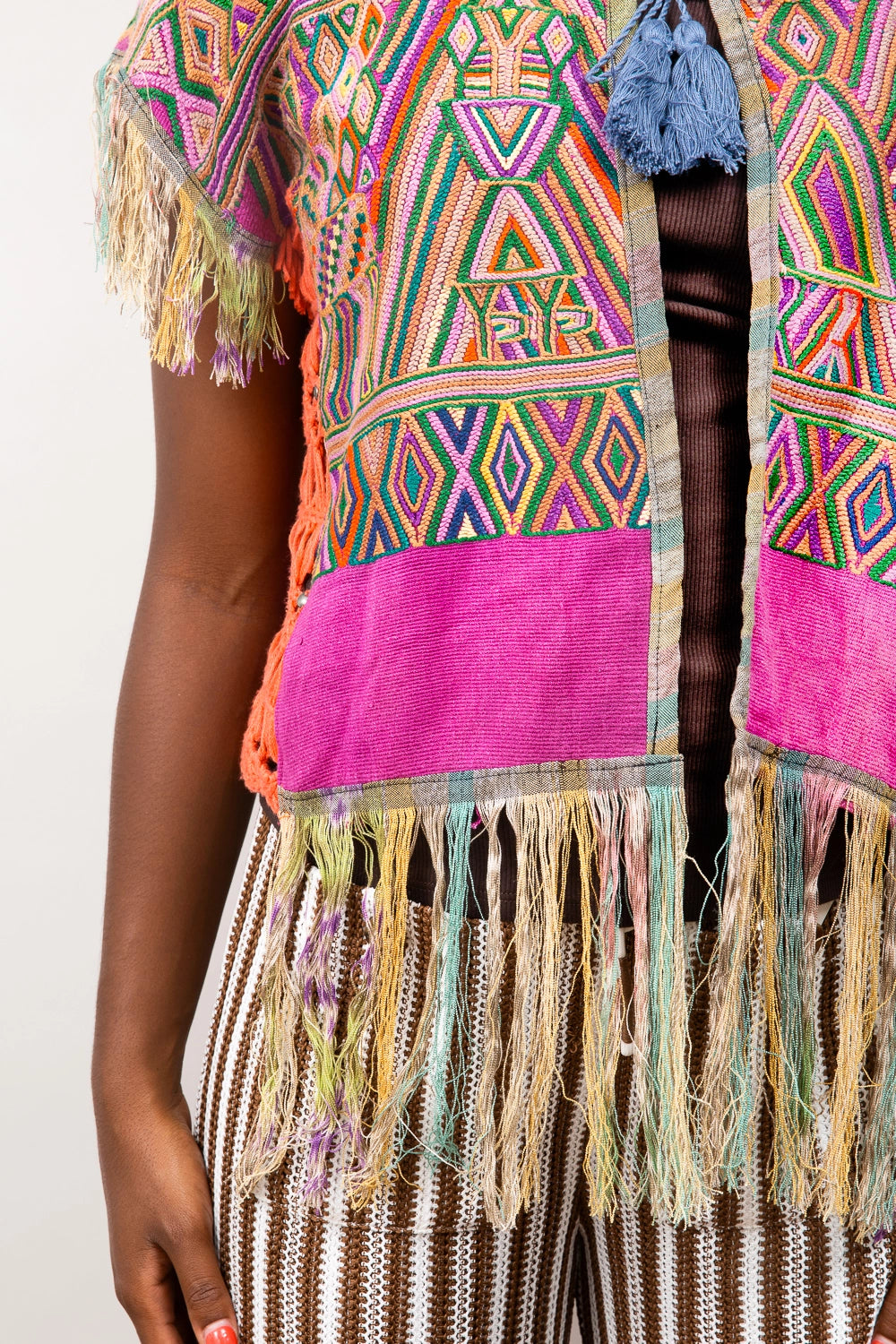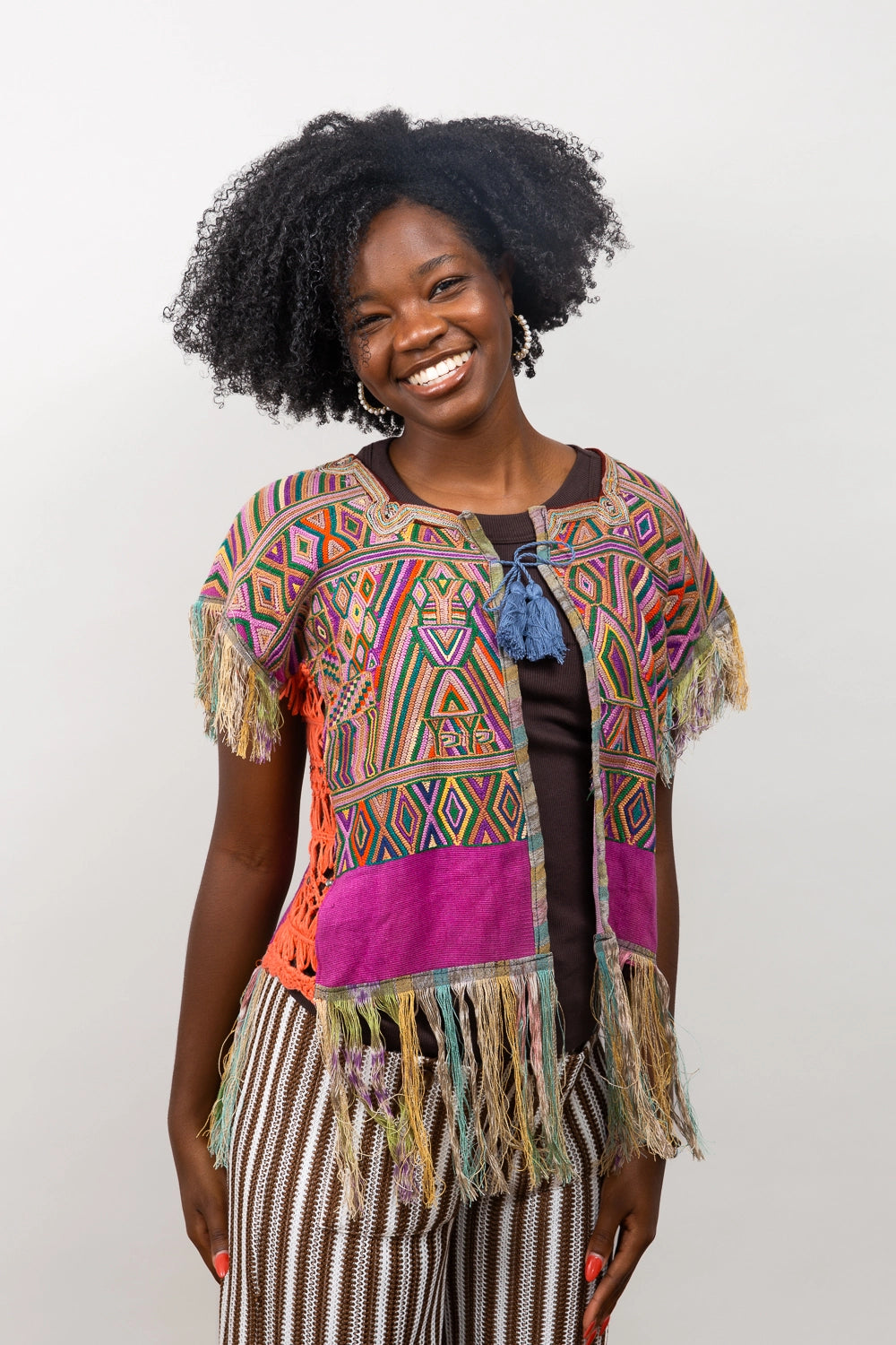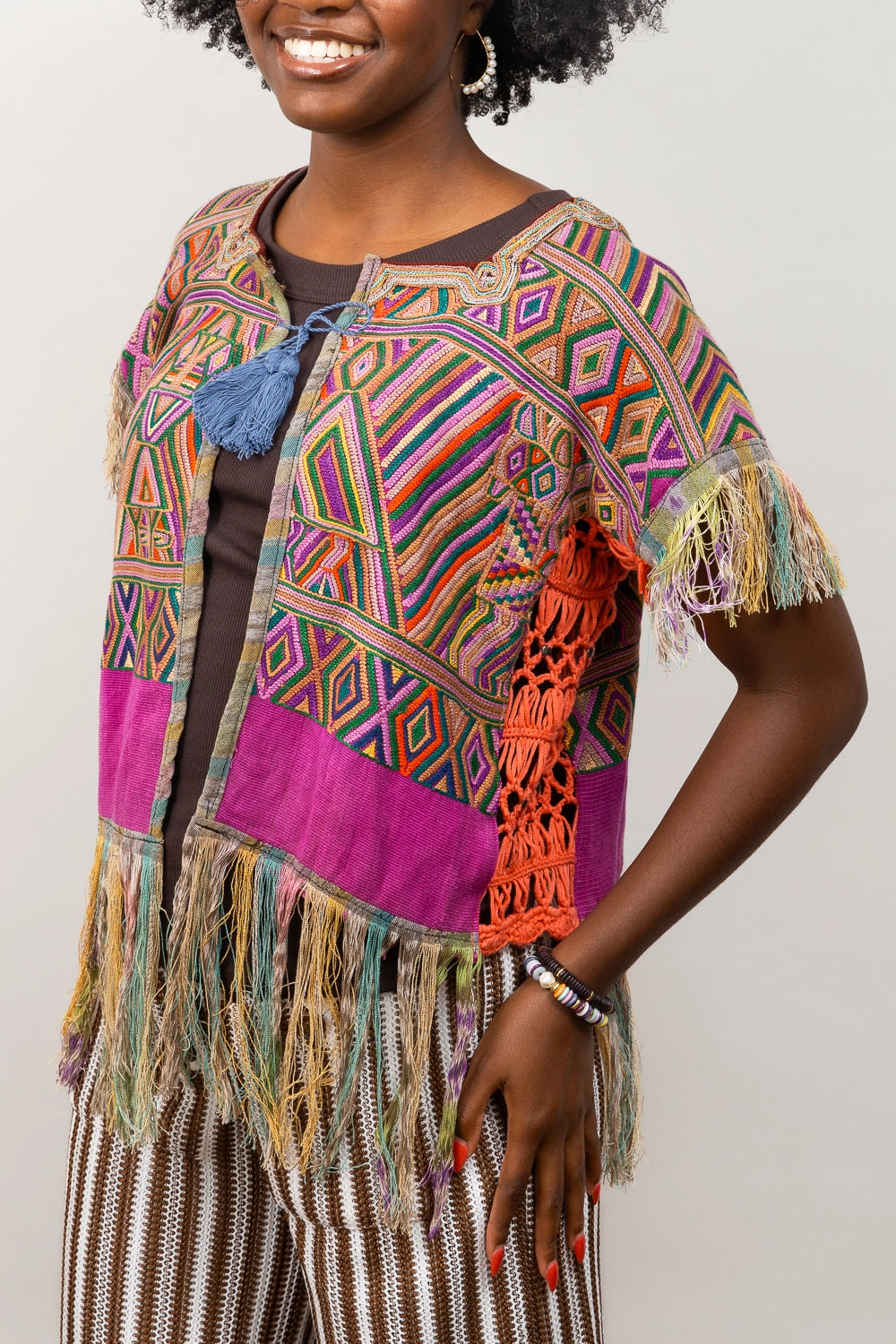 Vest-Like Fit, 1/4 Sleeve, Single Front Tie, Crochet Sides, Square Neckline, Fringe ends mid-thigh | Measurements: 20" Width, 20" Height (7.5" fringe)