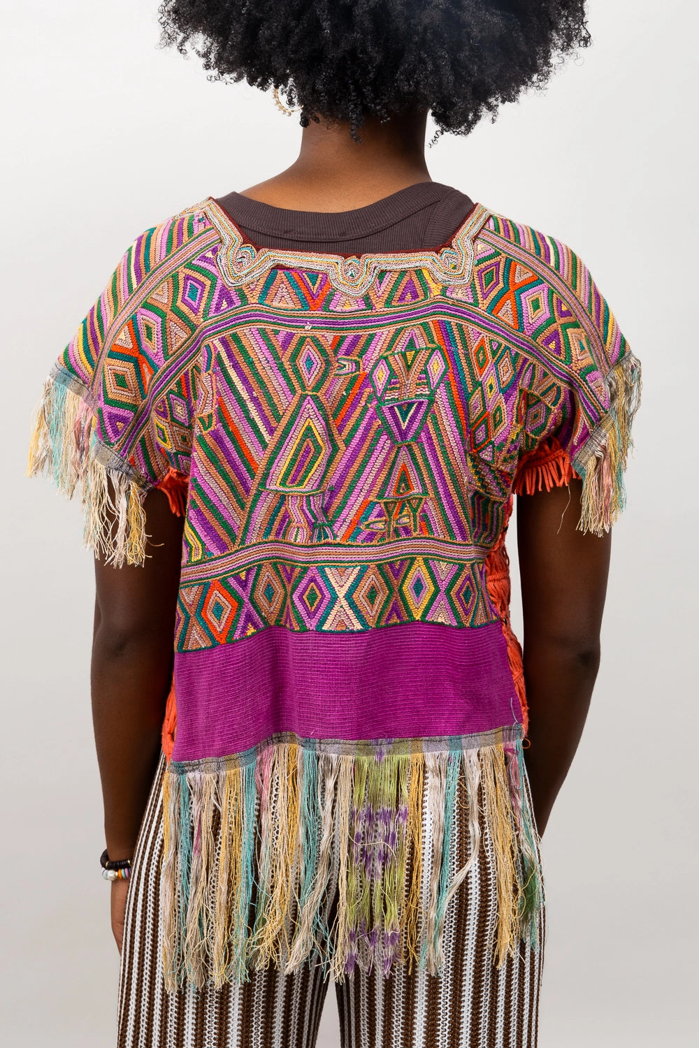 Rectangular-shaped huipil-style top with a square neckline, single front tie, and hand-stitched side detail. Handmade by Guatemalan artisans. Each piece is one of a kind. All sales are final - Because this is a one-of-a-kind, repurposed vintage piece, we’re not able to accept general returns. That said, we want you to love how it fits. If the sizing isn’t quite right, reach out to us —we’re happy to help
