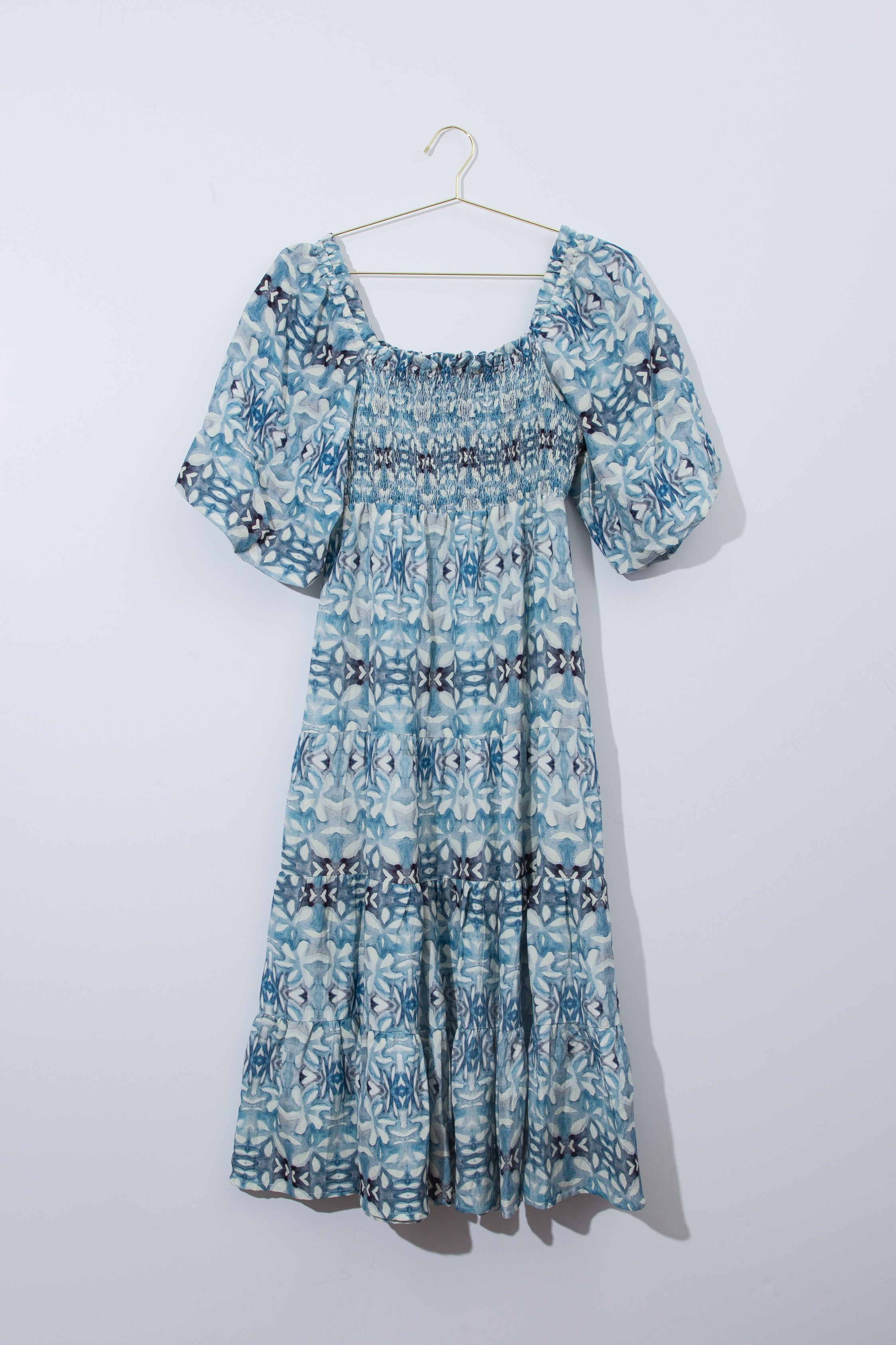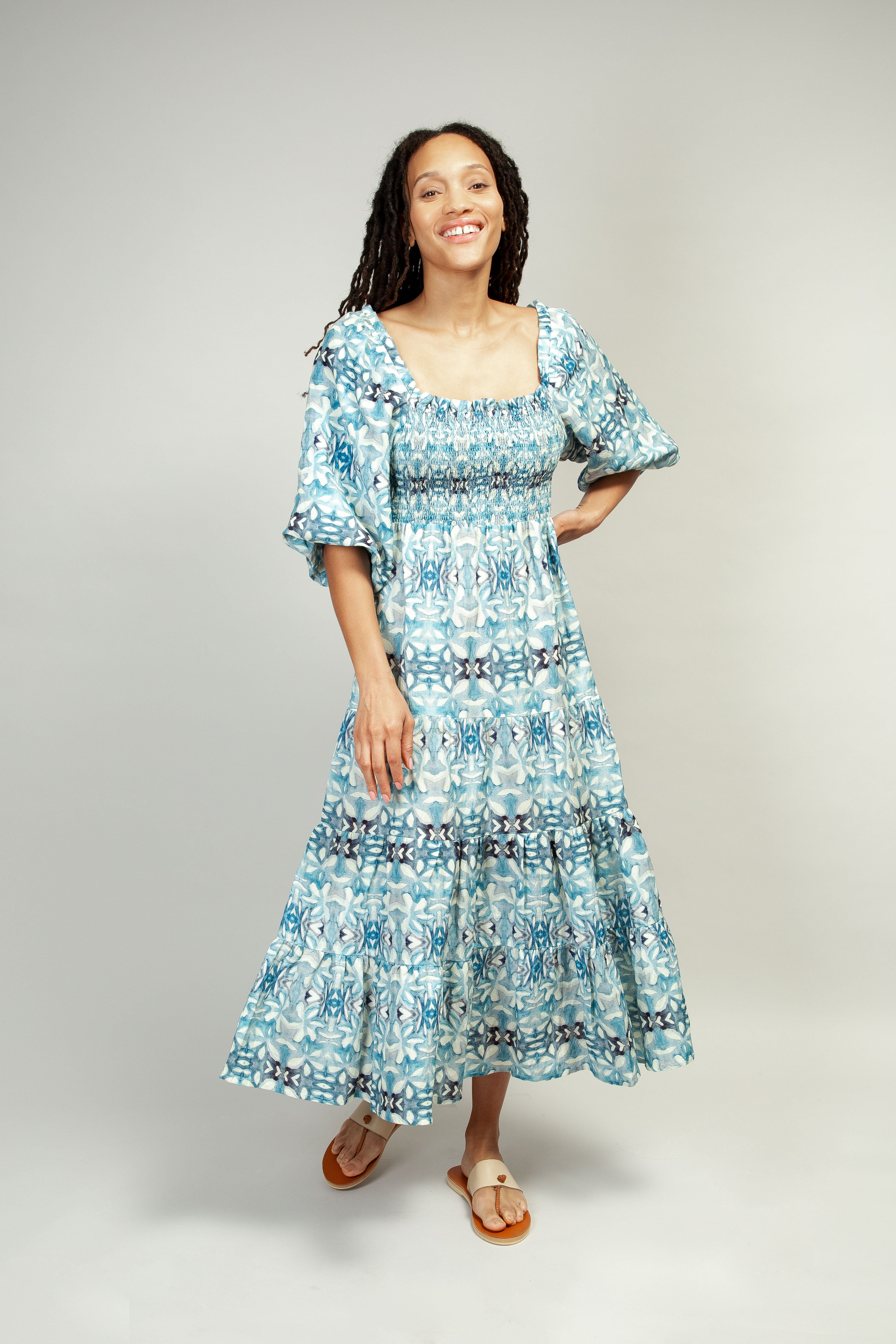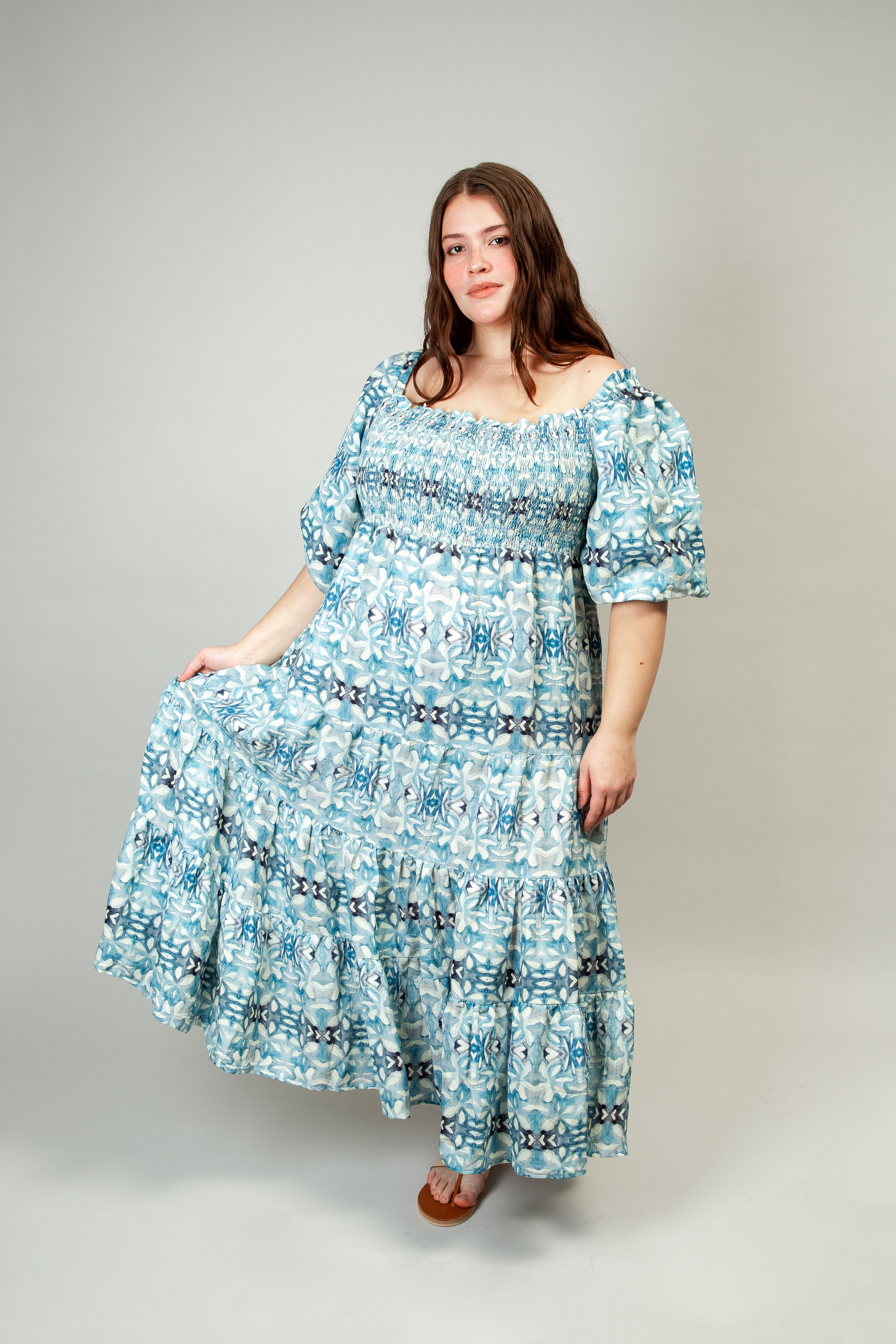 Square-Cut Neckline, Smocked Bust, Elbow Length Puff Sleeves, Tiered. | Size 1: 48" Long, 30"-34" Bust, 26"-38" Waist, Fits US Sizes 2-8 | Size 2: 49" Long, 36"-44" Bust, 32"-48" Waist, Fits US Size 10-16 | Size 3: 50" Long, 46"-52" Bust, 40"-56" Waist, Fits US Size 18-24