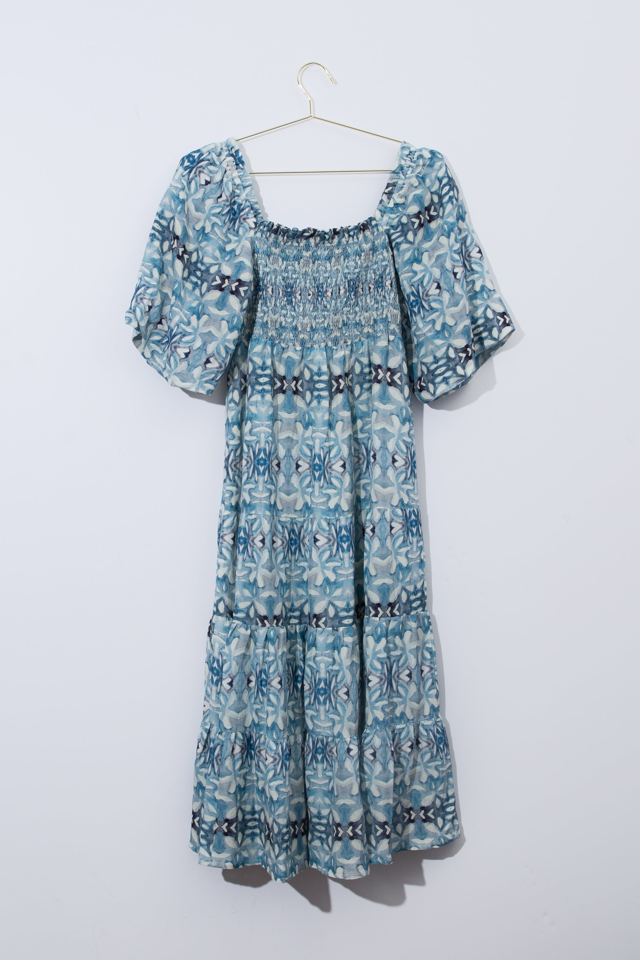 This bohemian-inspired maxi dress can be dressed up with a heeled boot or made casual with an easy sandal. The cool print brings to mind the crystal blue ocean and whitewashed buildings of the Greek island.