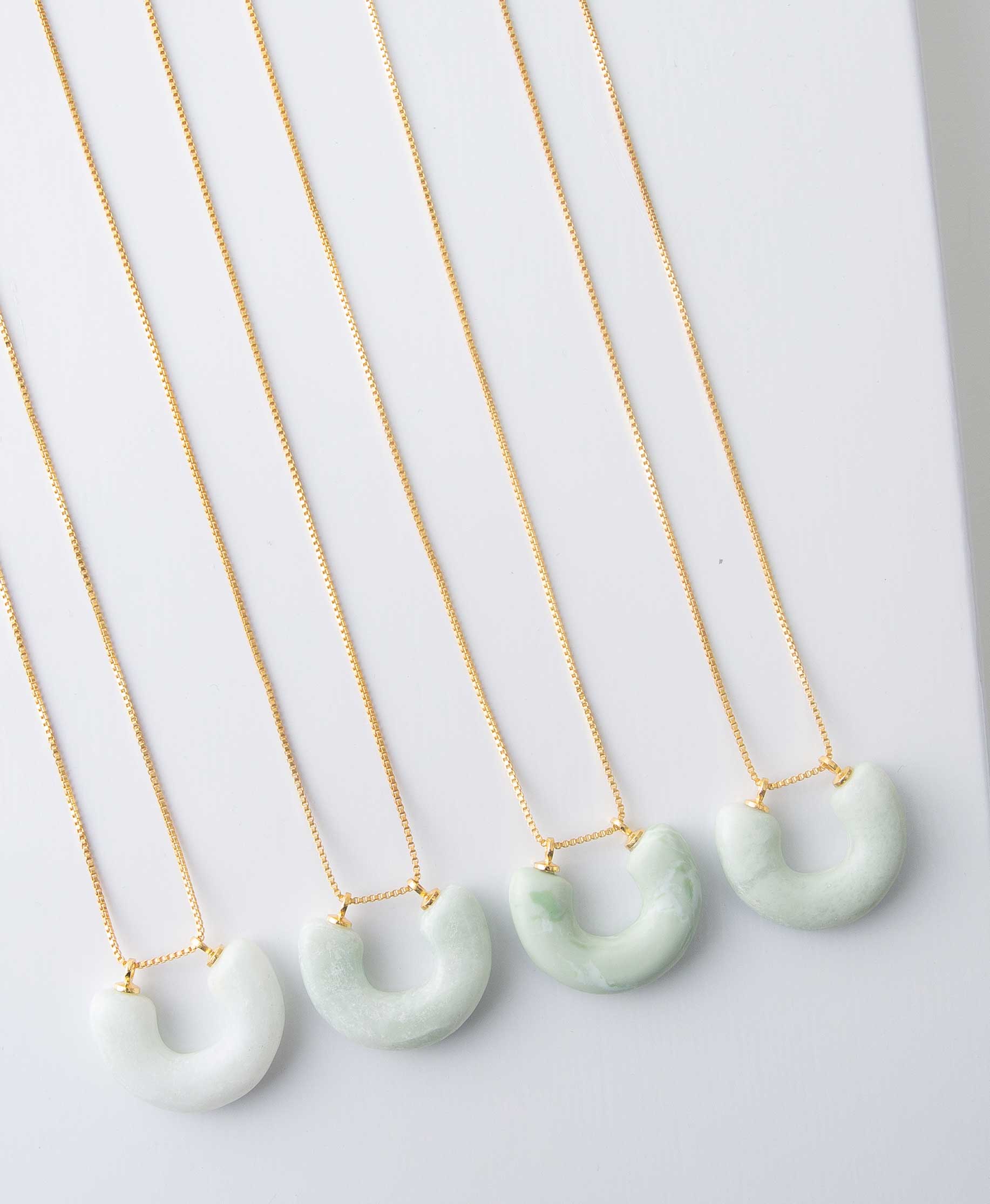 The Suspension Necklace feels like a work of art that wouldn't be out of place in a museum display. Smooth marble in a lovely shade of pale jade swings from a luxurious gold plated chain. Because of the handmade nature of this piece, the color and natural marble striations will vary slightly between necklaces.